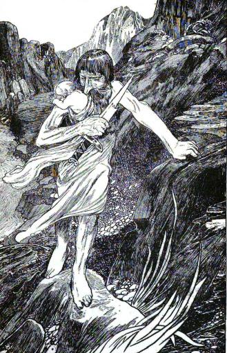 In this story, King Sigmund returns home from travel and hears that his pregnant wife Sisibe has been accused of illicit relations with a thrall. Although the accusation is a lie told by two of the King's advisors whose lustful advances Sisibe had rejected, Sigmund believes it and orders the noblemen to take her into the forest and execute her. One of the men is moved by pity for the innocent woman, and the two men fight. As they struggle with one another, Sisibe gives birth to a handsome boy and places him in a glass mead cask, which she lays beside her. During the ensuing violence, one of the men falls and kicks the glass vessel into a river. Witnessing what happened to her newborn son, Sisibe faints and soon dies. The vessel travels downstream and is cast up onto an island, where it shatters. The child is found by a hind, who carries him home in her mouth, allowing the infant to nurse alongside her twin fawns. In time, the boy is found by Mimir, a wise smith of the forest, who names him Sigurd (or Siegfried) and raises him as his own. |