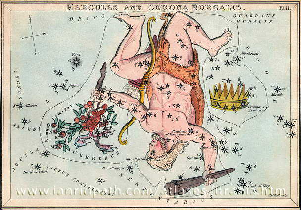 The constellation Hercules is depicted headlong on star maps. This
