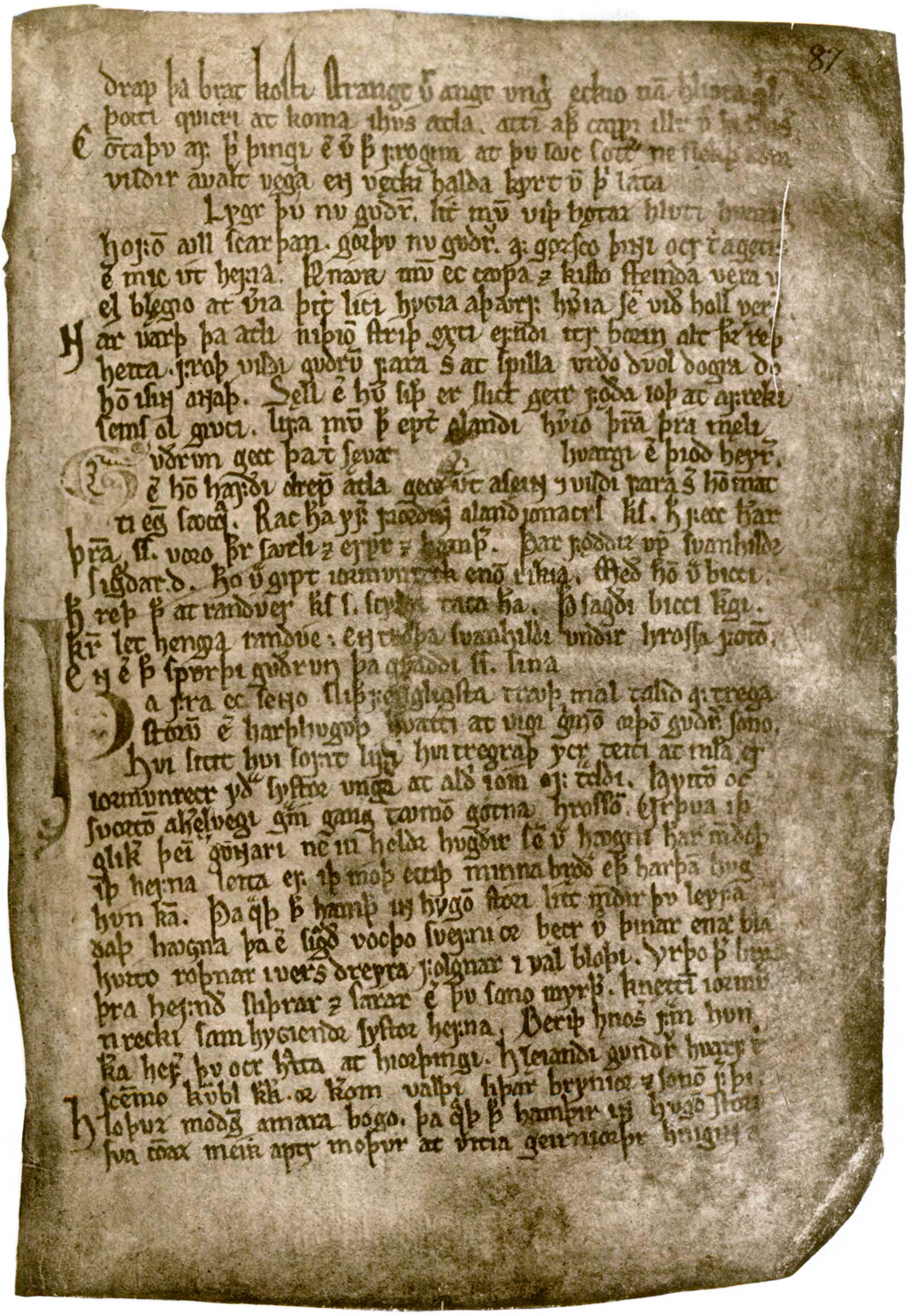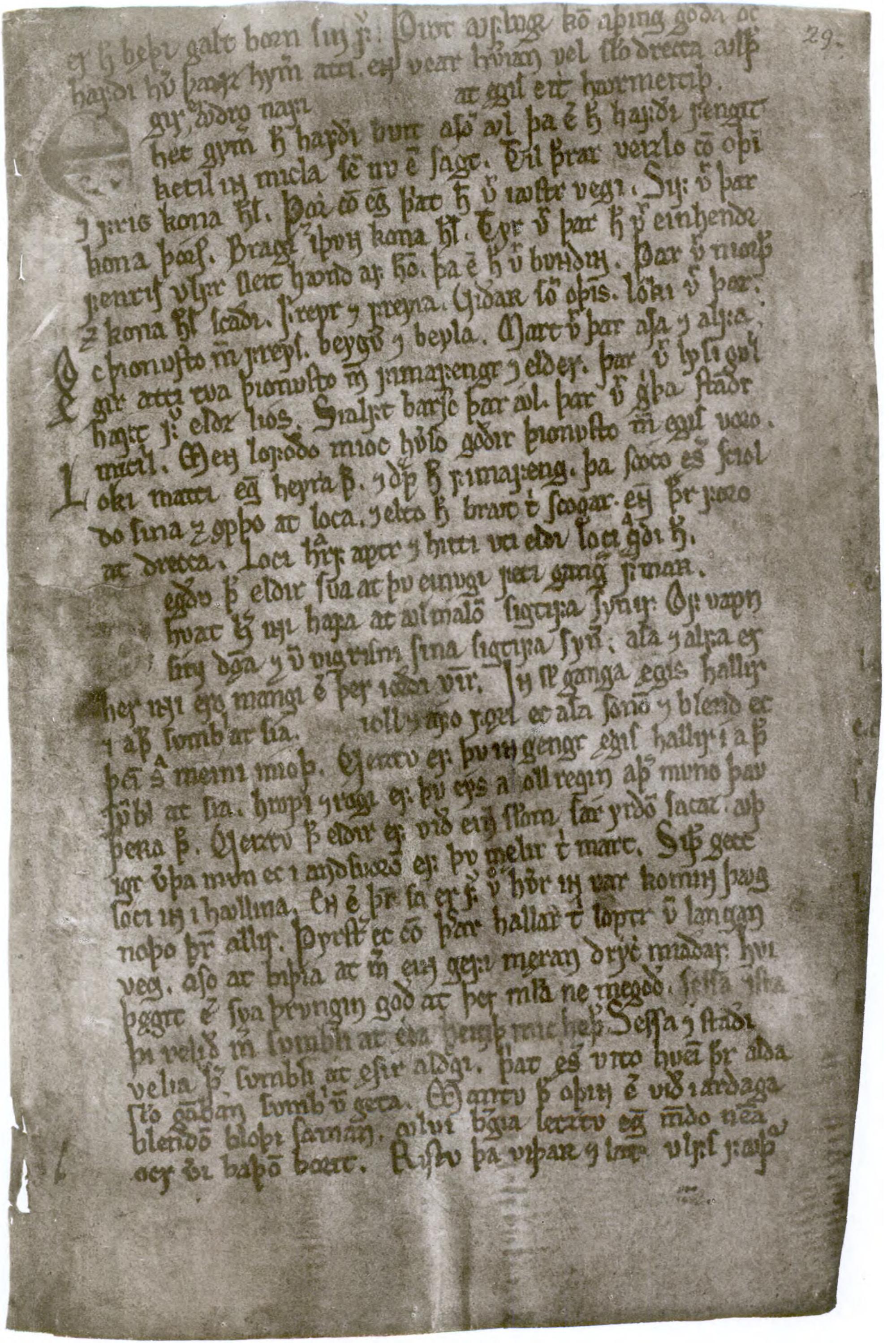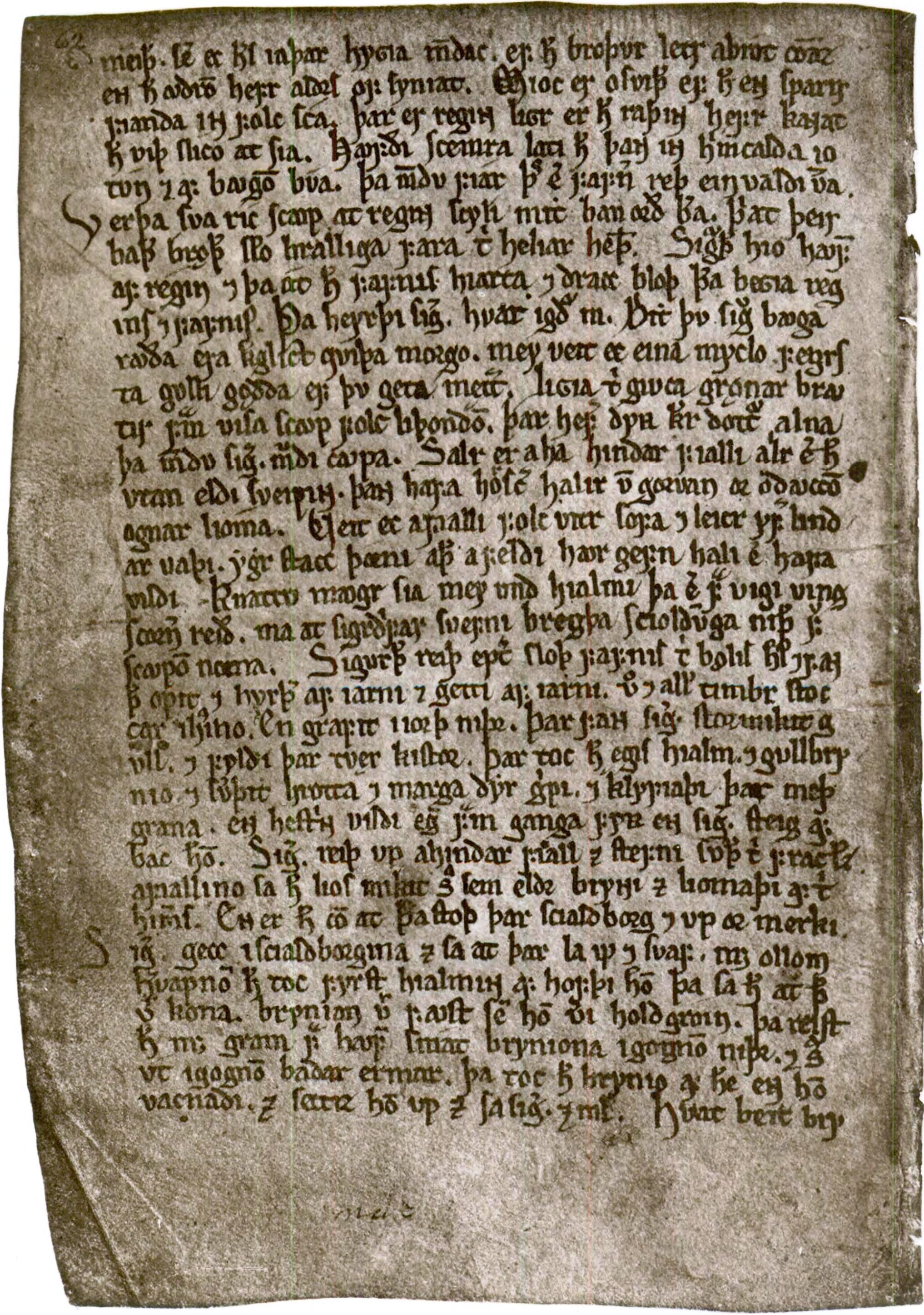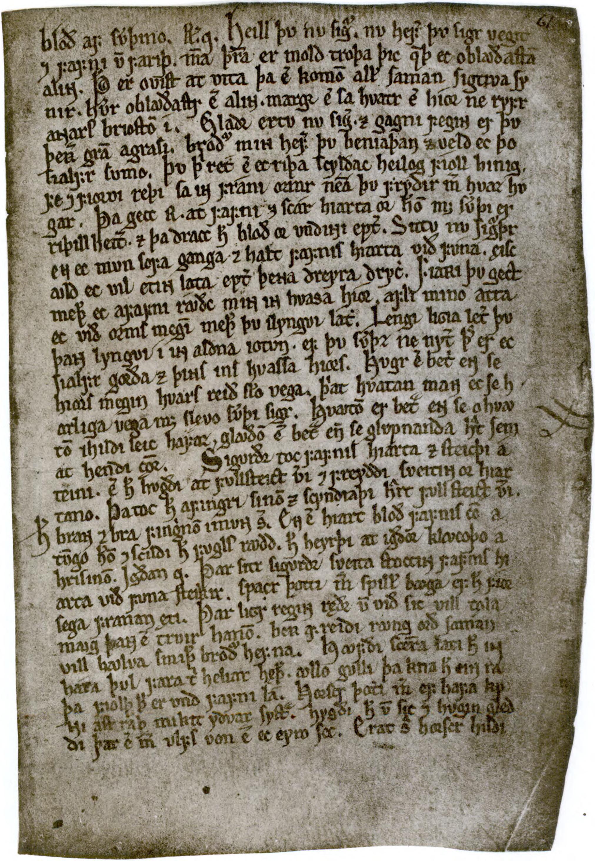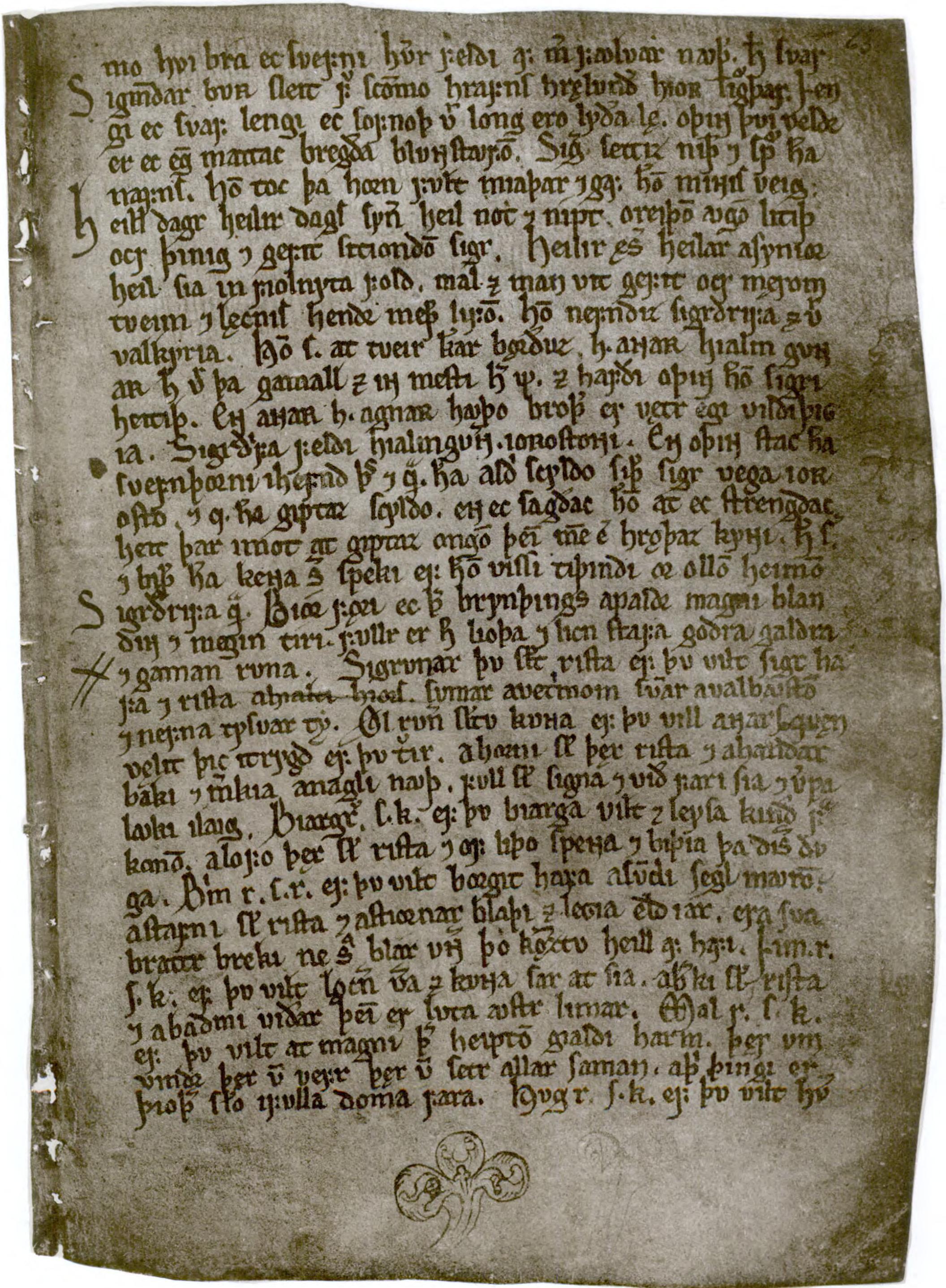 "For logical reasons, the Codex Regius (Gammel kongelig samling 2365 4to) is today regarded as one of the national treasures of Iceland. Significantly, it was one of the first two manuscripts to be returned to Iceland from Denmark in 1971. Its central importance is that it contains a (slightly rusty) key to the pagan religious world not only of the settlers of Iceland, but also of the people of Scandinavia as a whole, displaying the kind of raw poetic material that Snorri Sturluson utilized when assembling his prose Edda c.1220, and of which Saxo Grammaticus was clearly aware when writing his Gesta Danorum c.1200. It must never be forgotten, however, that the manuscript in question was written nearly 300 years after the official acceptance of Christianity in Iceland (in 999/750). The manuscript's contents may well have ancient, pagan roots, but researchers seeking to make use of this material should remember that it is likely to have existed in oral tradition long before it came to be recorded; and that while it now exists in textual form, it was originally meant to be received orally and visually in performance rather than read privately. ... To judge from the small size of these manuscripts and the economical use they make of space, neither was judged by the people of the time as being as important as, for example, the Möðruvallabók and Flateyjarbók manuscripts of the sagas, or the Stjórn manuscript of part of the Bible." Einar G. Petursson, Medieval Scandinavia, (1988): "Codex Regius of the Poetic Edda is an Icelandic manuscript of ninety small quarto pages, but the fifth gathering, probably 16 pages, is now lost. The manuscript was written by one hand not known elsewhere, and is dated palaeographically to about 1270-1280. Codex Regius is the most important manuscript of eddic poetry. It now contains 29 poems in systemic order; the first 10 lays are about the ancient Norse gods, but the remaining part is about ancient heroes. Codex Regius is a copy of an older manuscript now lost. The fragmentary AM 748 I 4to contains, in no particular order, seven eddic lays, and one of them, Baldrs draumr, is not preserved elsewhere. This manuscript is dated to about 1300 or a little later. The textual relationship between the two manuscripts points to a common written original. In the 1220s, Snorri Sturlusson wrote a textbook on poetry, called Snorra Edda or the Prose Edda. It is almost certain that he used the text of the mythical poems Vafþrúðnismál and Grímnismál from the common written source underlying the Poetic Edda. "...It is not known whether Codex Regius had a name originally. In 1623, Jón Guðmundsson lærði ('the learned') mentioned for the first time an Edda Sæmundr Sigfússon fróði ('the wise'; 1056-1133), older than Snorra Edda. In 1643, when Bishop Brynjólfur Sveinsson in Skáholt obtained Codex Regius (we do not know from where), he believed it was the Edda by Sæmundar, although it is now thought that Sæmundar played no role in collecting or writing Codex Regius. A name and note in the manuscript indicate that it had been in Skagafjörður (in the north) or on the Reykjanes peninsula (southwest) during the previous years. The last poem before the lacuna is Sigrdrifumál, with the last part of it missing. This poem is preserved complete in paper copies from the 17th century. The lay is found in Völsungasaga as well, but in 1641 Brynjólfur Sveinsson received the only parchment manuscript of this saga, and at least two commentaries on Sigurdrifumál were written for him. It seems certian that there is a direct connection between the copying of the complete text of Sigrdrifumál and the activities in connection with Völsungasaga after 1641. The lacuna in Codex Regius accordingly occurred after 1641, but before 1643. Brynjólfur Sveinsson presented the manuscript to the King of Denmark in 1662, hence the name Codex Regius ('King's Book'). In the Royal Library, it was given number GkS 2365 4to. It was brought back to Iceland on April 21, 1971, and is now in the Árni Magnússon Institute in Iceland." Gudbrand Vigfússon, Corpus Poeticum Boreale, 1883: "Chief of all Icelandic manuscripts, the treasure of the Royal Library at Copenhagen is Codex Regius (R), no. 2365, the history of whose appearance in the learned world we have already spoken of; a narrow octavo, now in an 18th century binding, with the royal arms of Christian VII (c. 1780). What its former binding in Bishop's Brynjólf's days was, is not known; the second binder did the vellum some harm by plowing its edges. We should have liked to have had its original cover, but that was probably lost before the worthy, but misguided, librarian ordered it a new coat. It consists of five complete sheets and one final sheet, from which three blank leaves have been cut; but between the fourth and the fifth sheets a sheet at least is missing (the sheet of the Lacuna). This Lacuna existed when Bishop Byrnjólf got the manuscript for he has noted at the top of the fifth sheet, 'λόγος άκεΦαλος' ['A speech or tale without beginning']. But for this the manuscript is perfect. The first page, dark and grimy, is yet perfectly preserved, signed by the good Bishop's monogram. There is no superscription (Edda or otherwise) in the old hand." [etc.] |