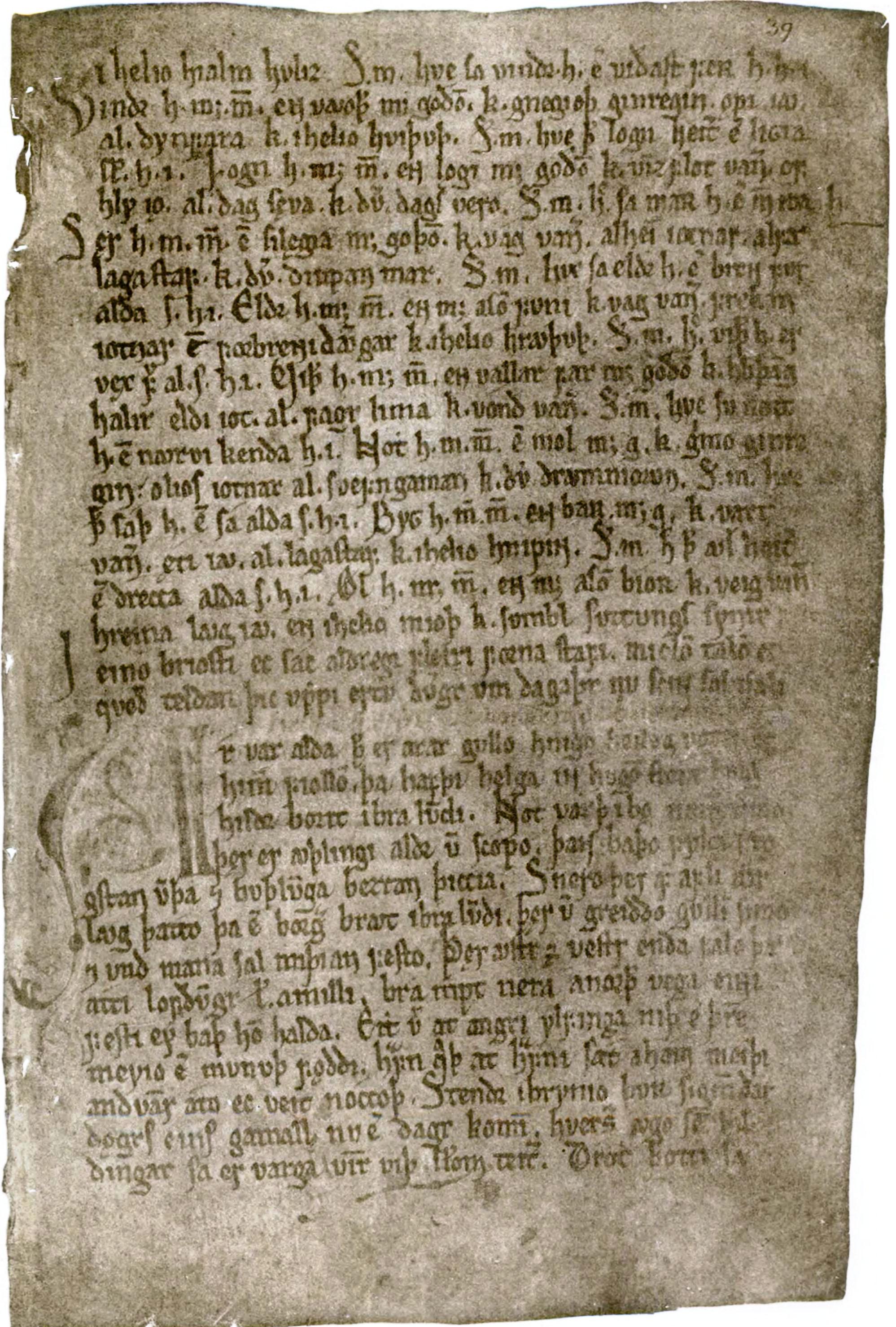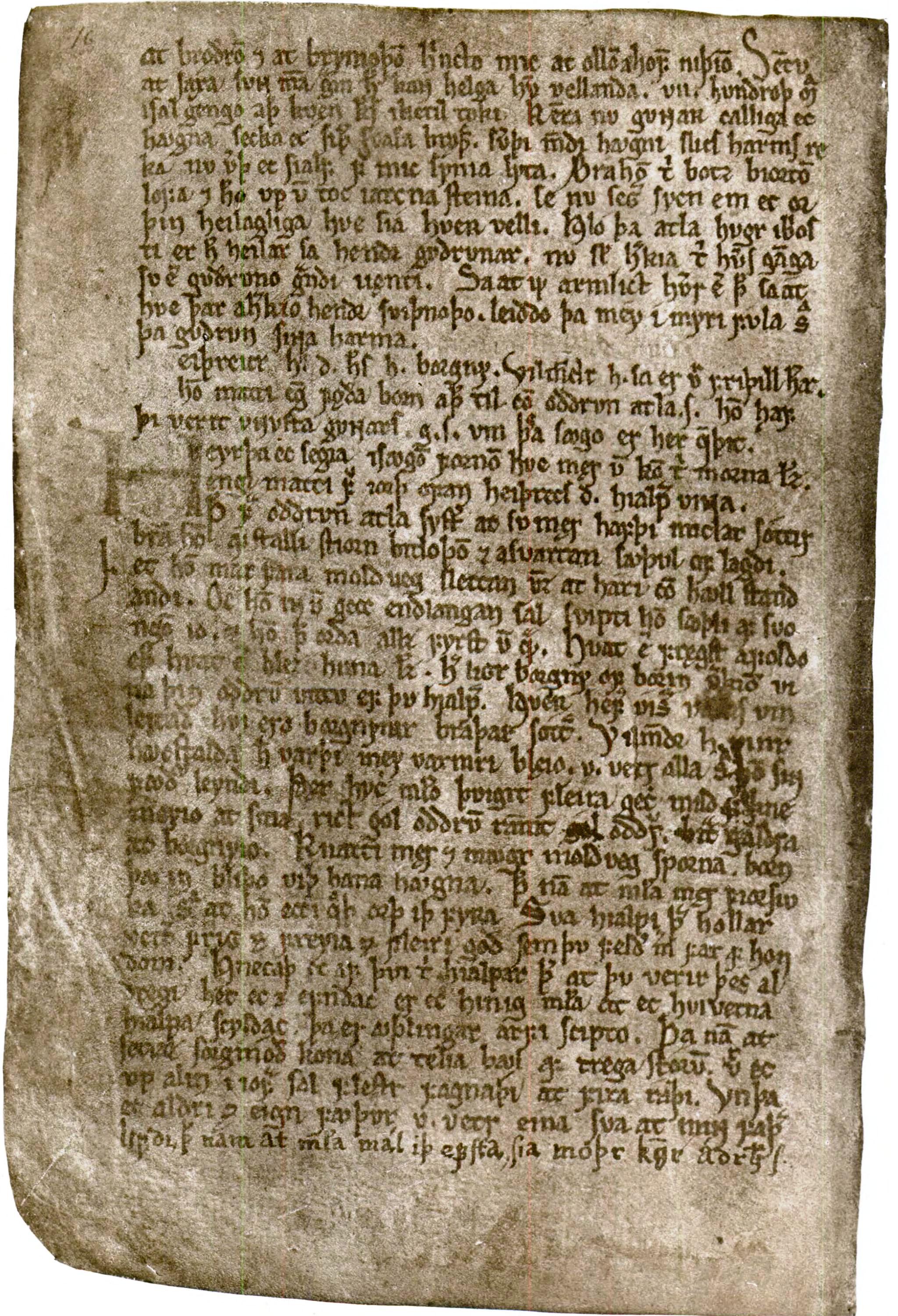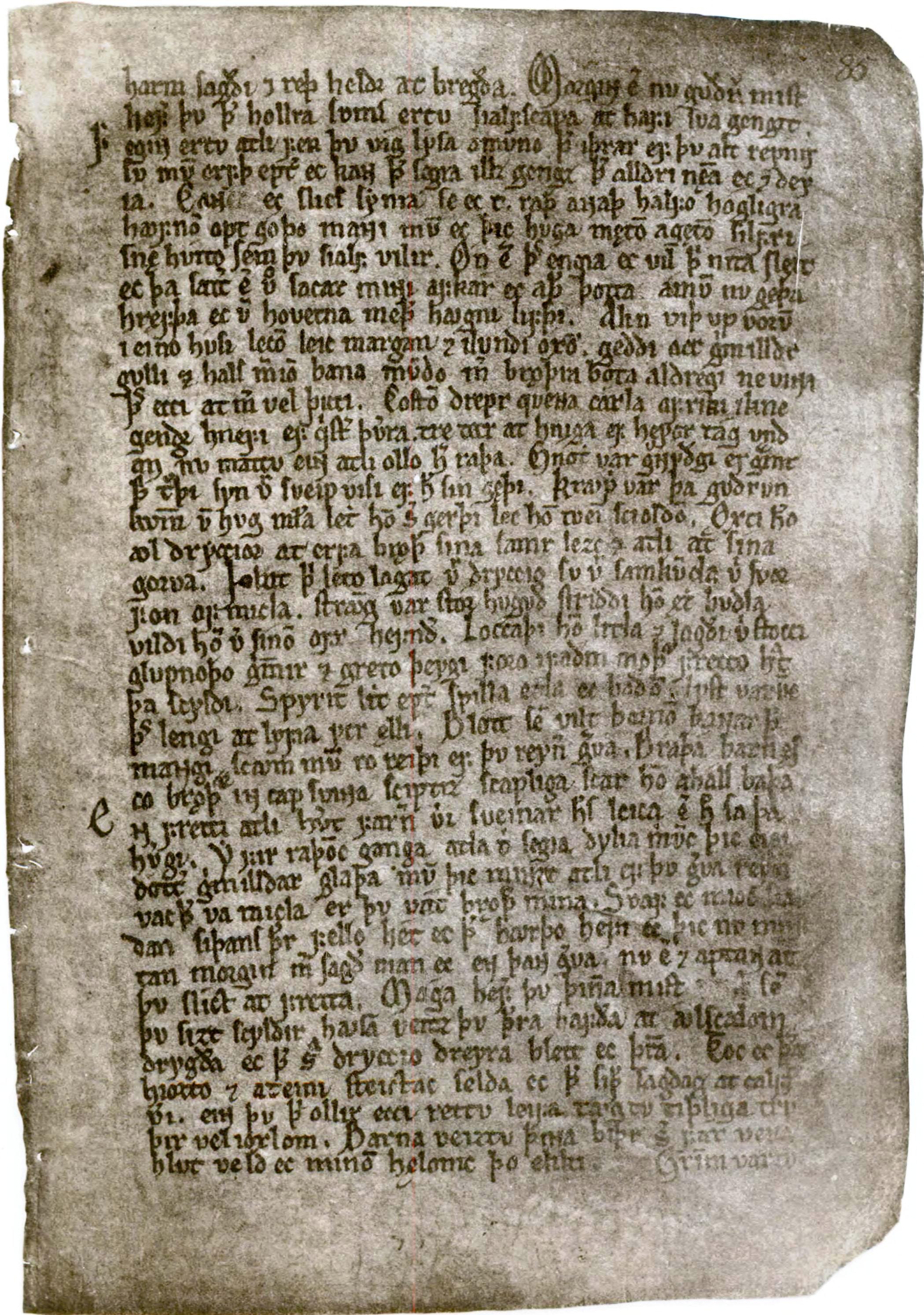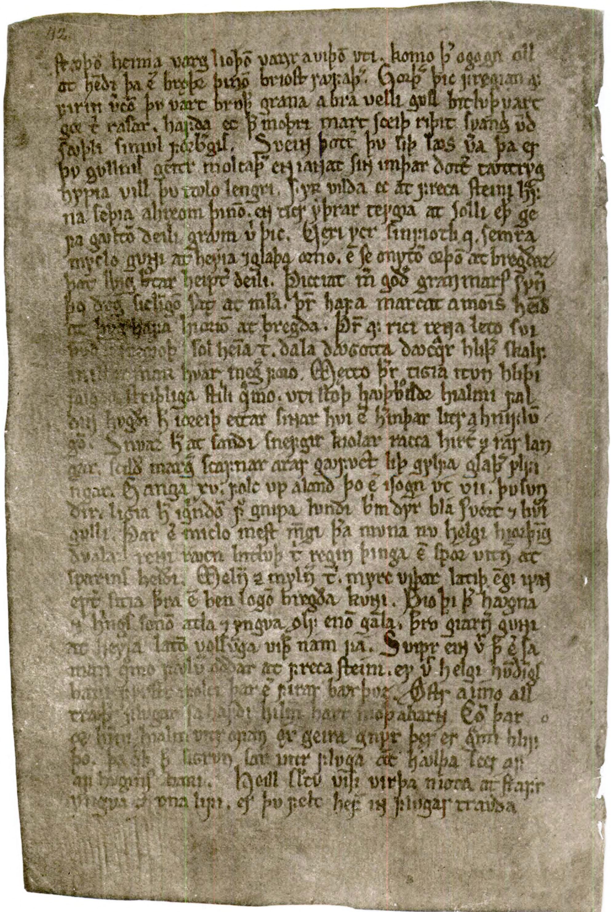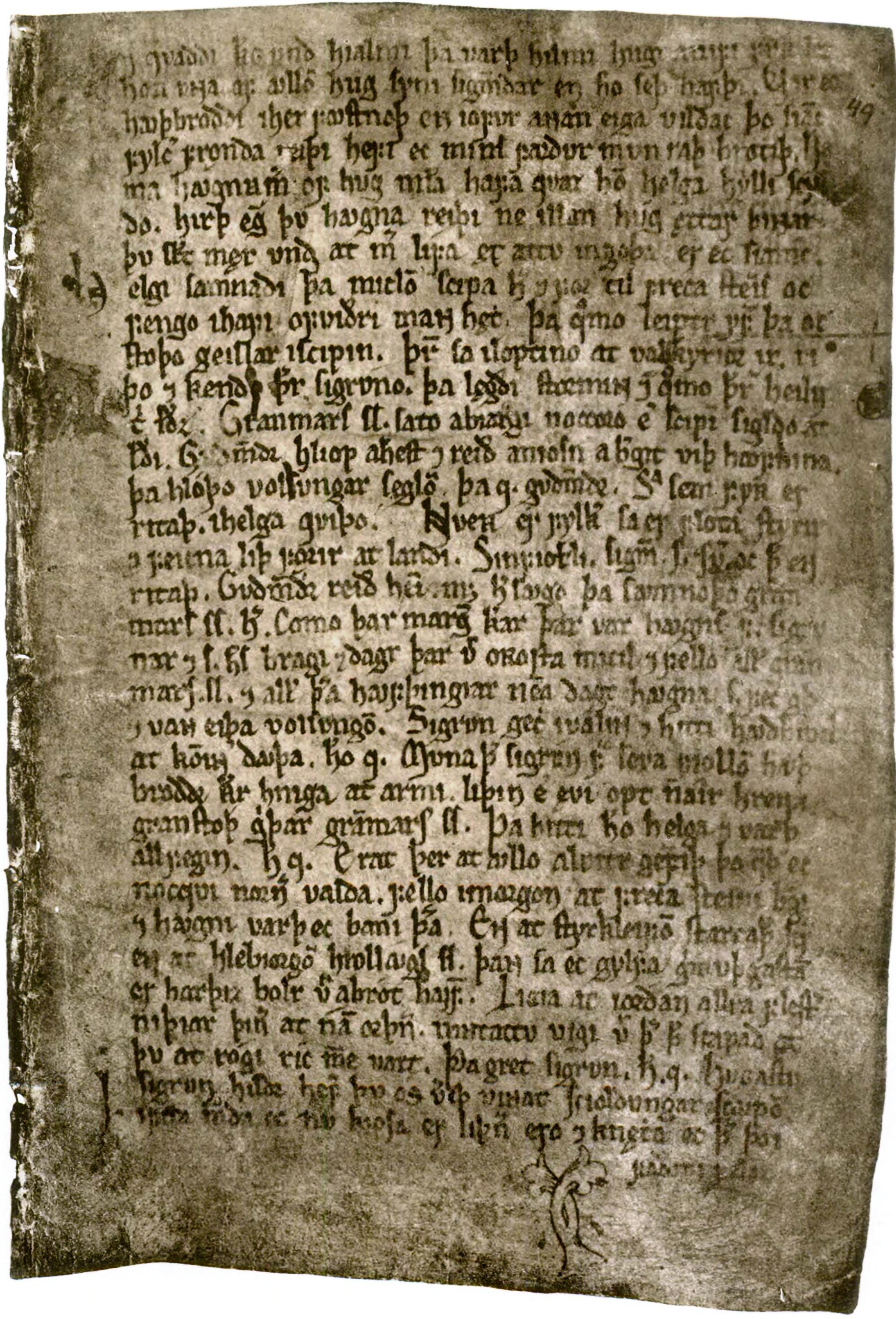 "For logical reasons, the Codex Regius (Gammel kongelig samling 2365 4to) is today regarded as one of the national treasures of Iceland. Significantly, it was one of the first two manuscripts to be returned to Iceland from Denmark in 1971. Its central importance is that it contains a (slightly rusty) key to the pagan religious world not only of the settlers of Iceland, but also of the people of Scandinavia as a whole, displaying the kind of raw poetic material that Snorri Sturluson utilized when assembling his prose Edda c.1220, and of which Saxo Grammaticus was clearly aware when writing his Gesta Danorum c.1200. It must never be forgotten, however, that the manuscript in question was written nearly 300 years after the official acceptance of Christianity in Iceland (in 999/750). The manuscript's contents may well have ancient, pagan roots, but researchers seeking to make use of this material should remember that it is likely to have existed in oral tradition long before it came to be recorded; and that while it now exists in textual form, it was originally meant to be received orally and visually in performance rather than read privately. ... To judge from the small size of these manuscripts and the economical use they make of space, neither was judged by the people of the time as being as important as, for example, the Möðruvallabók and Flateyjarbók manuscripts of the sagas, or the Stjórn manuscript of part of the Bible." Einar G. Petursson, Medieval Scandinavia, (1988): "Codex Regius of the Poetic Edda is an Icelandic manuscript of ninety small quarto pages, but the fifth gathering, probably 16 pages, is now lost. The manuscript was written by one hand not known elsewhere, and is dated palaeographically to about 1270-1280. Codex Regius is the most important manuscript of eddic poetry. It now contains 29 poems in systemic order; the first 10 lays are about the ancient Norse gods, but the remaining part is about ancient heroes. Codex Regius is a copy of an older manuscript now lost. The fragmentary AM 748 I 4to contains, in no particular order, seven eddic lays, and one of them, Baldrs draumr, is not preserved elsewhere. This manuscript is dated to about 1300 or a little later. The textual relationship between the two manuscripts points to a common written original. In the 1220s, Snorri Sturlusson wrote a textbook on poetry, called Snorra Edda or the Prose Edda. It is almost certain that he used the text of the mythical poems Vafþrúðnismál and Grímnismál from the common written source underlying the Poetic Edda. "...It is not known whether Codex Regius had a name originally. In 1623, Jón Guðmundsson lærði ('the learned') mentioned for the first time an Edda Sæmundr Sigfússon fróði ('the wise'; 1056-1133), older than Snorra Edda. In 1643, when Bishop Brynjólfur Sveinsson in Skáholt obtained Codex Regius (we do not know from where), he believed it was the Edda by Sæmundar, although it is now thought that Sæmundar played no role in collecting or writing Codex Regius. A name and note in the manuscript indicate that it had been in Skagafjörður (in the north) or on the Reykjanes peninsula (southwest) during the previous years. The last poem before the lacuna is Sigrdrifumál, with the last part of it missing. This poem is preserved complete in paper copies from the 17th century. The lay is found in Völsungasaga as well, but in 1641 Brynjólfur Sveinsson received the only parchment manuscript of this saga, and at least two commentaries on Sigurdrifumál were written for him. It seems certian that there is a direct connection between the copying of the complete text of Sigrdrifumál and the activities in connection with Völsungasaga after 1641. The lacuna in Codex Regius accordingly occurred after 1641, but before 1643. Brynjólfur Sveinsson presented the manuscript to the King of Denmark in 1662, hence the name Codex Regius ('King's Book'). In the Royal Library, it was given number GkS 2365 4to. It was brought back to Iceland on April 21, 1971, and is now in the Árni Magnússon Institute in Iceland." Gudbrand Vigfússon, Corpus Poeticum Boreale, 1883: "Chief of all Icelandic manuscripts, the treasure of the Royal Library at Copenhagen is Codex Regius (R), no. 2365, the history of whose appearance in the learned world we have already spoken of; a narrow octavo, now in an 18th century binding, with the royal arms of Christian VII (c. 1780). What its former binding in Bishop's Brynjólf's days was, is not known; the second binder did the vellum some harm by plowing its edges. We should have liked to have had its original cover, but that was probably lost before the worthy, but misguided, librarian ordered it a new coat. It consists of five complete sheets and one final sheet, from which three blank leaves have been cut; but between the fourth and the fifth sheets a sheet at least is missing (the sheet of the Lacuna). This Lacuna existed when Bishop Byrnjólf got the manuscript for he has noted at the top of the fifth sheet, 'λόγος άκεΦαλος' ['A speech or tale without beginning']. But for this the manuscript is perfect. The first page, dark and grimy, is yet perfectly preserved, signed by the good Bishop's monogram. There is no superscription (Edda or otherwise) in the old hand." [etc.] |