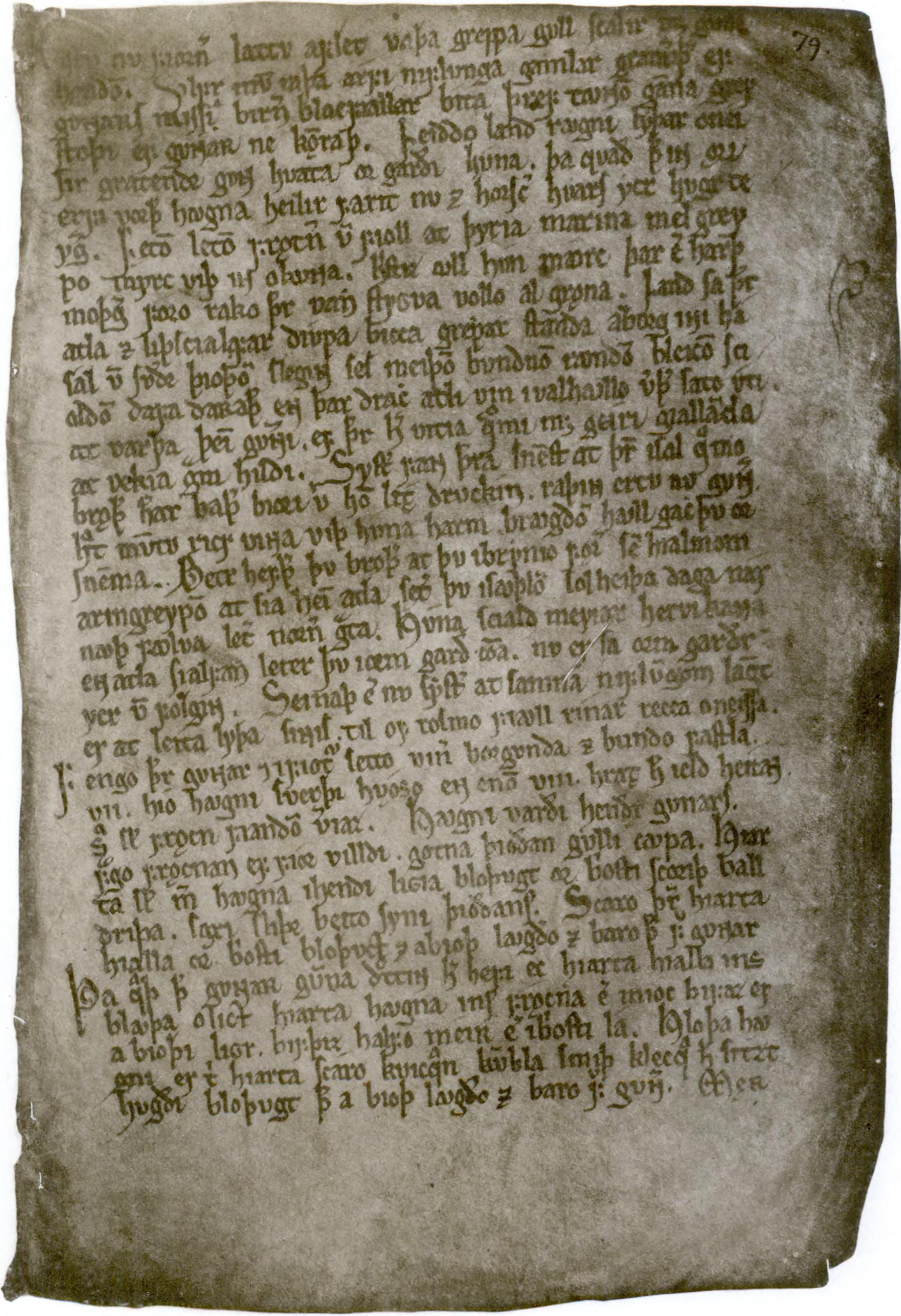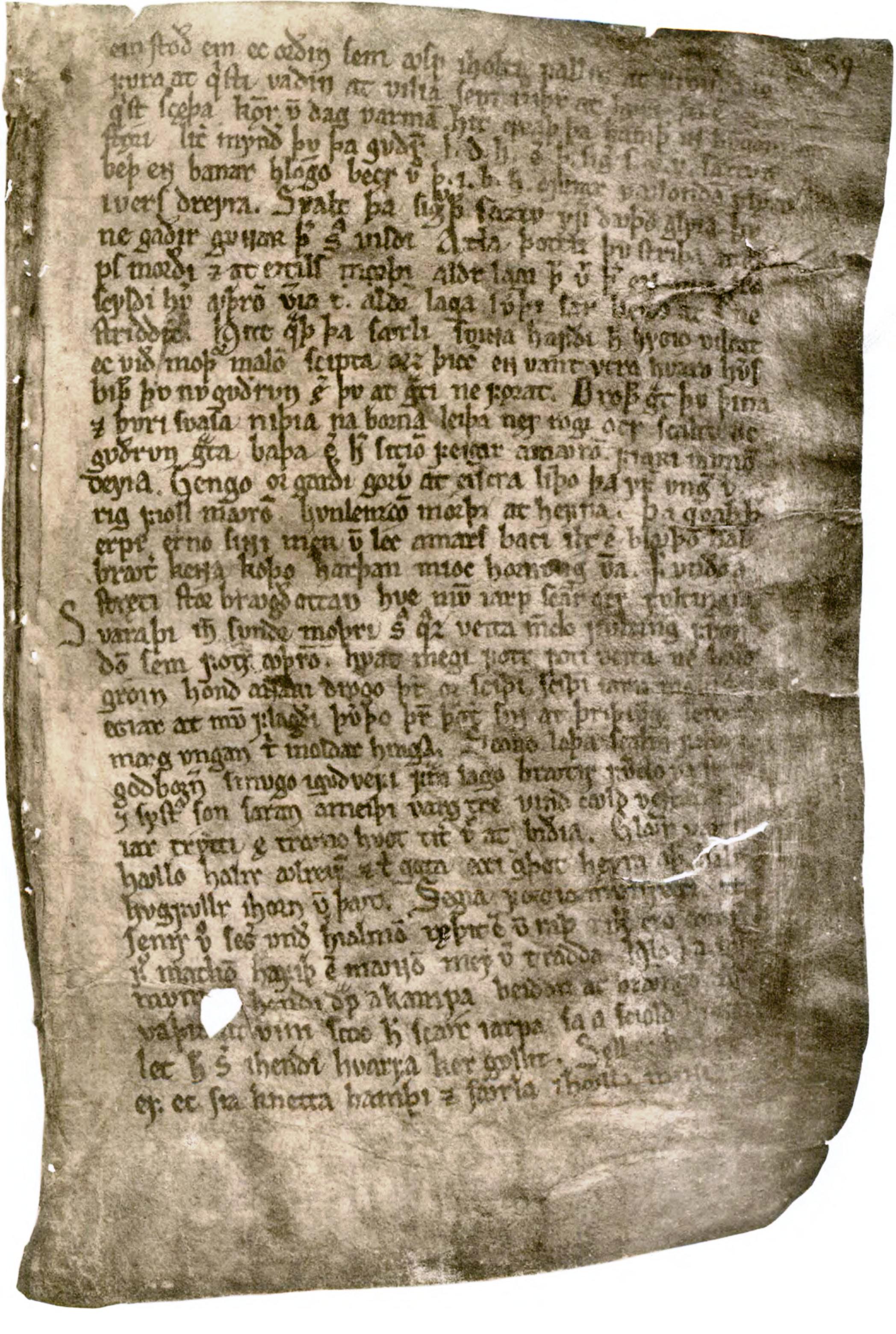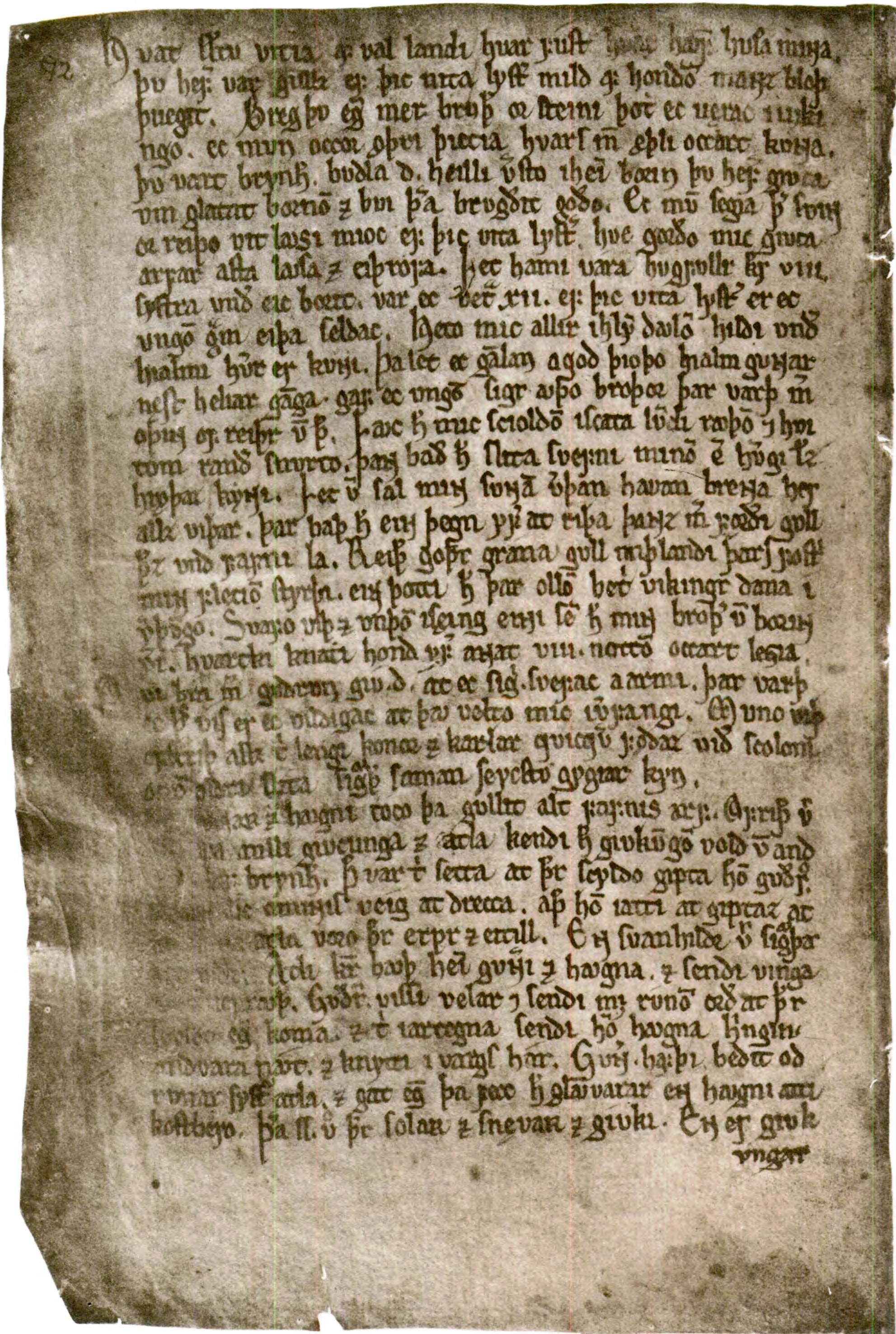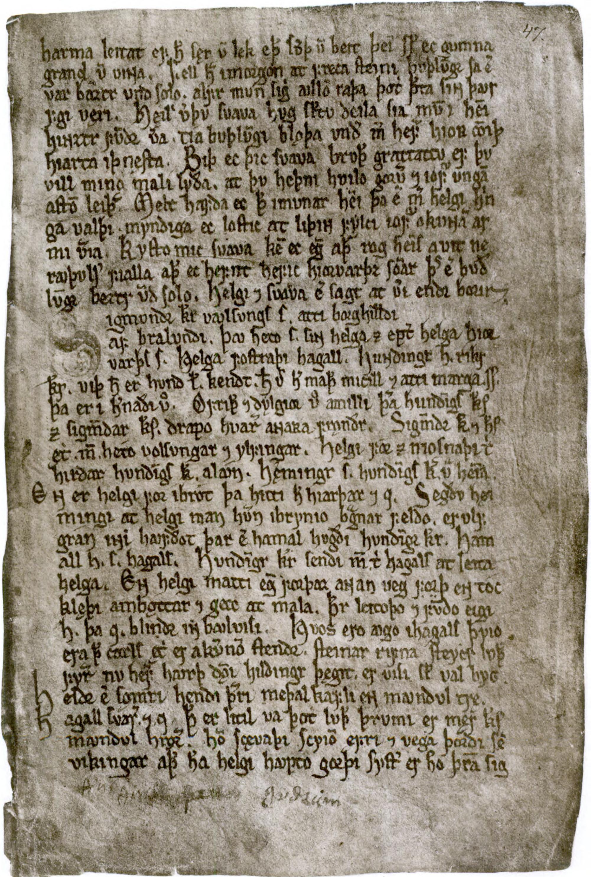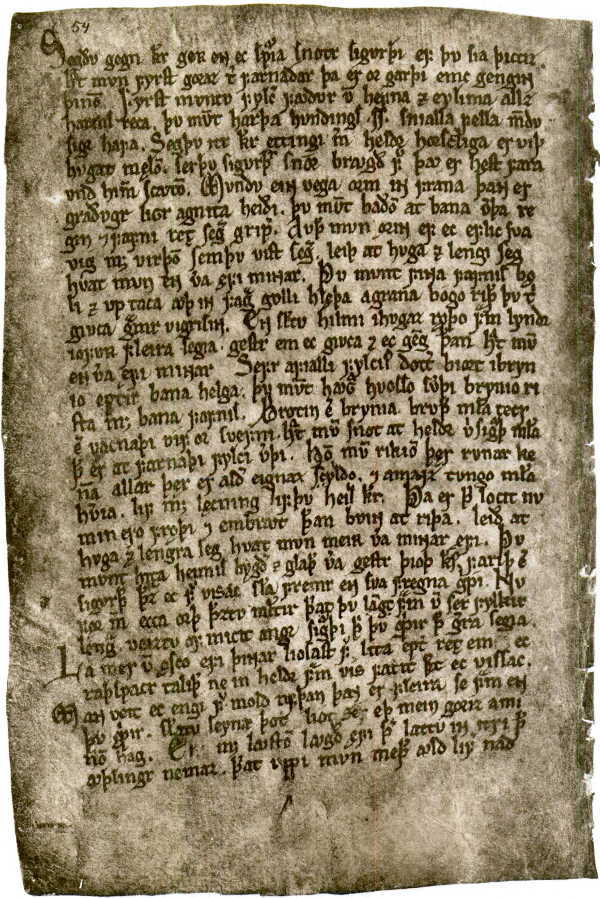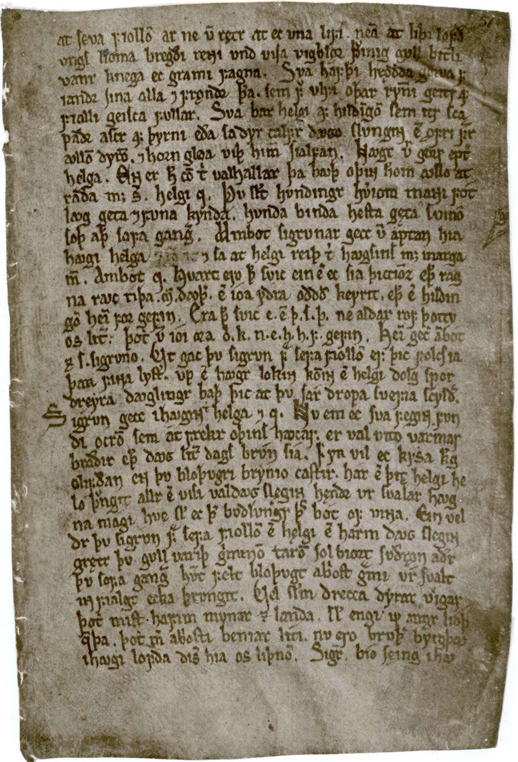 "For logical reasons, the Codex Regius (Gammel kongelig samling 2365 4to) is today regarded as one of the national treasures of Iceland. Significantly, it was one of the first two manuscripts to be returned to Iceland from Denmark in 1971. Its central importance is that it contains a (slightly rusty) key to the pagan religious world not only of the settlers of Iceland, but also of the people of Scandinavia as a whole, displaying the kind of raw poetic material that Snorri Sturluson utilized when assembling his prose Edda c.1220, and of which Saxo Grammaticus was clearly aware when writing his Gesta Danorum c.1200. It must never be forgotten, however, that the manuscript in question was written nearly 300 years after the official acceptance of Christianity in Iceland (in 999/750). The manuscript's contents may well have ancient, pagan roots, but researchers seeking to make use of this material should remember that it is likely to have existed in oral tradition long before it came to be recorded; and that while it now exists in textual form, it was originally meant to be received orally and visually in performance rather than read privately. ... To judge from the small size of these manuscripts and the economical use they make of space, neither was judged by the people of the time as being as important as, for example, the Möðruvallabók and Flateyjarbók manuscripts of the sagas, or the Stjórn manuscript of part of the Bible." Einar G. Petursson, Medieval Scandinavia, (1988): "Codex Regius of the Poetic Edda is an Icelandic manuscript of ninety small quarto pages, but the fifth gathering, probably 16 pages, is now lost. The manuscript was written by one hand not known elsewhere, and is dated palaeographically to about 1270-1280. Codex Regius is the most important manuscript of eddic poetry. It now contains 29 poems in systemic order; the first 10 lays are about the ancient Norse gods, but the remaining part is about ancient heroes. Codex Regius is a copy of an older manuscript now lost. The fragmentary AM 748 I 4to contains, in no particular order, seven eddic lays, and one of them, Baldrs draumr, is not preserved elsewhere. This manuscript is dated to about 1300 or a little later. The textual relationship between the two manuscripts points to a common written original. In the 1220s, Snorri Sturlusson wrote a textbook on poetry, called Snorra Edda or the Prose Edda. It is almost certain that he used the text of the mythical poems Vafþrúðnismál and Grímnismál from the common written source underlying the Poetic Edda. "...It is not known whether Codex Regius had a name originally. In 1623, Jón Guðmundsson lærði ('the learned') mentioned for the first time an Edda Sæmundr Sigfússon fróði ('the wise'; 1056-1133), older than Snorra Edda. In 1643, when Bishop Brynjólfur Sveinsson in Skáholt obtained Codex Regius (we do not know from where), he believed it was the Edda by Sæmundar, although it is now thought that Sæmundar played no role in collecting or writing Codex Regius. A name and note in the manuscript indicate that it had been in Skagafjörður (in the north) or on the Reykjanes peninsula (southwest) during the previous years. The last poem before the lacuna is Sigrdrifumál, with the last part of it missing. This poem is preserved complete in paper copies from the 17th century. The lay is found in Völsungasaga as well, but in 1641 Brynjólfur Sveinsson received the only parchment manuscript of this saga, and at least two commentaries on Sigurdrifumál were written for him. It seems certian that there is a direct connection between the copying of the complete text of Sigrdrifumál and the activities in connection with Völsungasaga after 1641. The lacuna in Codex Regius accordingly occurred after 1641, but before 1643. Brynjólfur Sveinsson presented the manuscript to the King of Denmark in 1662, hence the name Codex Regius ('King's Book'). In the Royal Library, it was given number GkS 2365 4to. It was brought back to Iceland on April 21, 1971, and is now in the Árni Magnússon Institute in Iceland." Gudbrand Vigfússon, Corpus Poeticum Boreale, 1883: "Chief of all Icelandic manuscripts, the treasure of the Royal Library at Copenhagen is Codex Regius (R), no. 2365, the history of whose appearance in the learned world we have already spoken of; a narrow octavo, now in an 18th century binding, with the royal arms of Christian VII (c. 1780). What its former binding in Bishop's Brynjólf's days was, is not known; the second binder did the vellum some harm by plowing its edges. We should have liked to have had its original cover, but that was probably lost before the worthy, but misguided, librarian ordered it a new coat. It consists of five complete sheets and one final sheet, from which three blank leaves have been cut; but between the fourth and the fifth sheets a sheet at least is missing (the sheet of the Lacuna). This Lacuna existed when Bishop Byrnjólf got the manuscript for he has noted at the top of the fifth sheet, 'λόγος άκεΦαλος' ['A speech or tale without beginning']. But for this the manuscript is perfect. The first page, dark and grimy, is yet perfectly preserved, signed by the good Bishop's monogram. There is no superscription (Edda or otherwise) in the old hand." [etc.] |