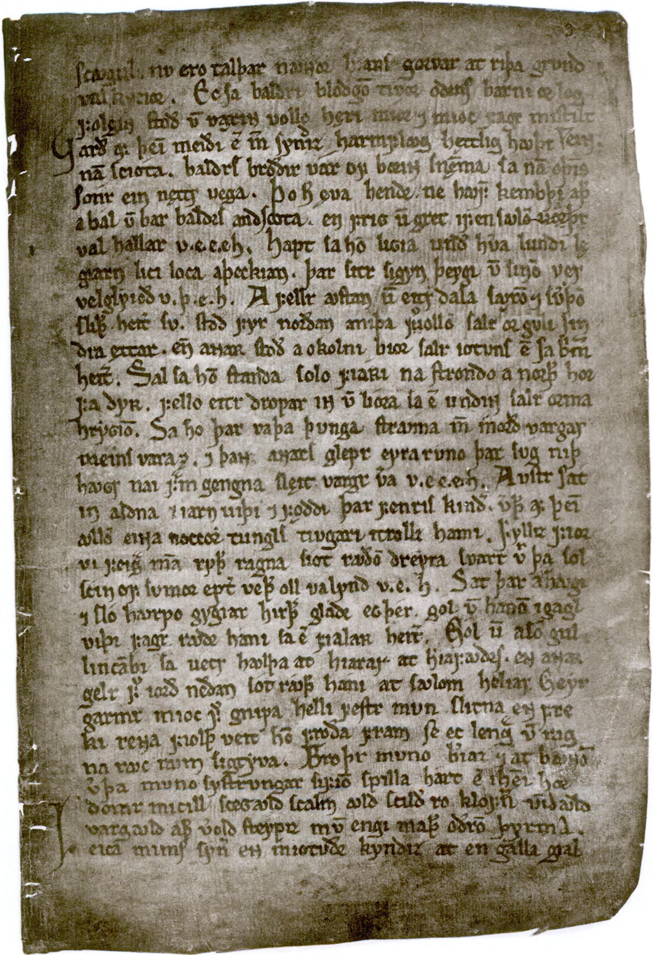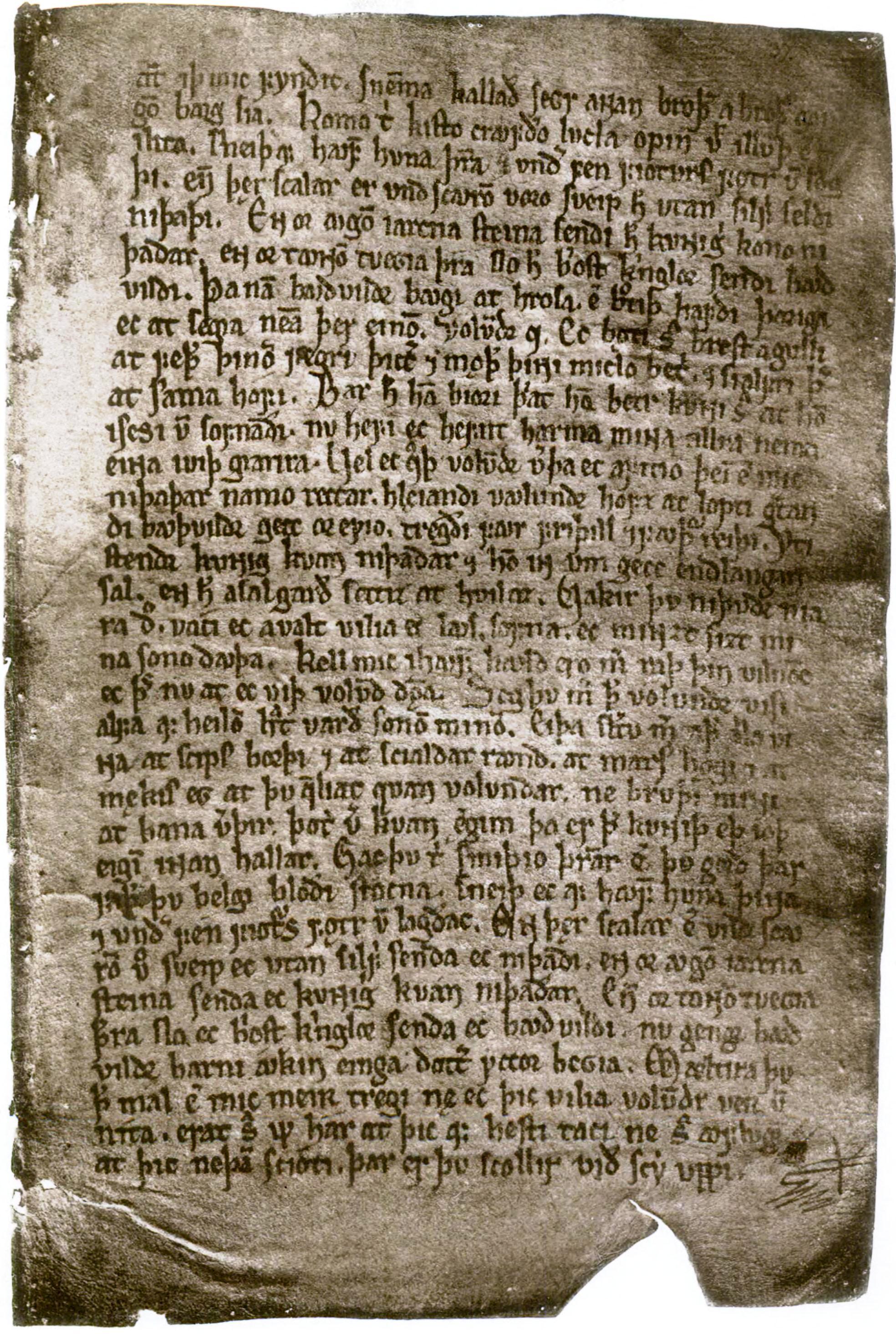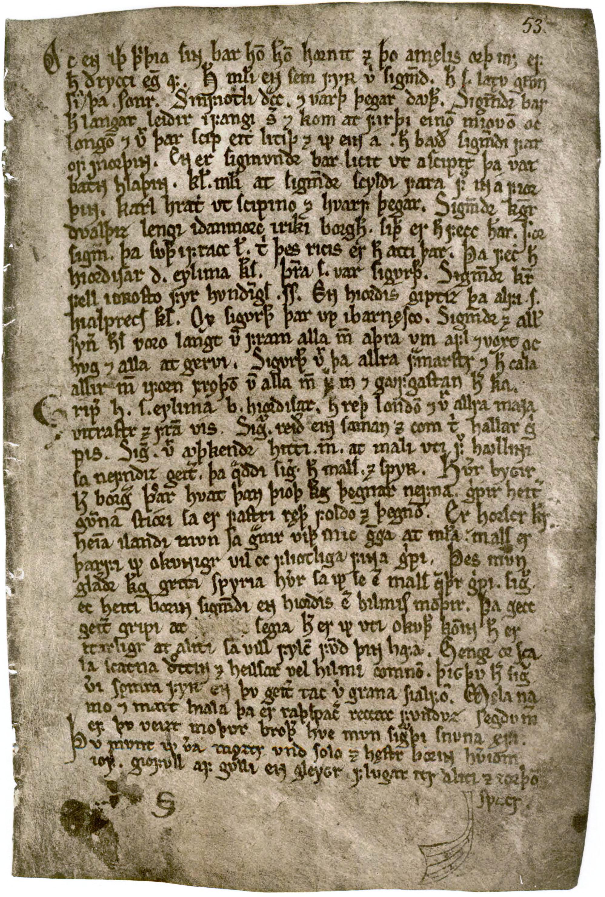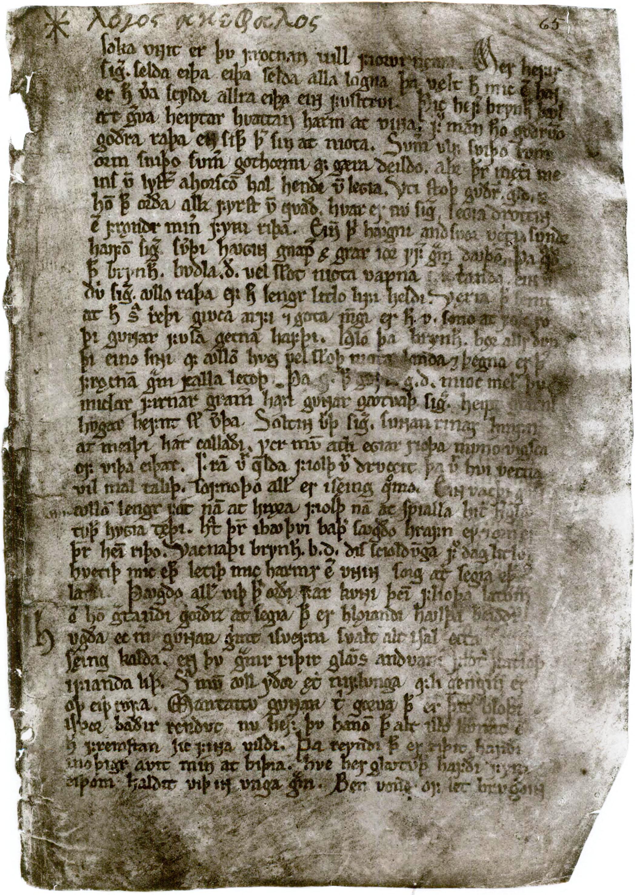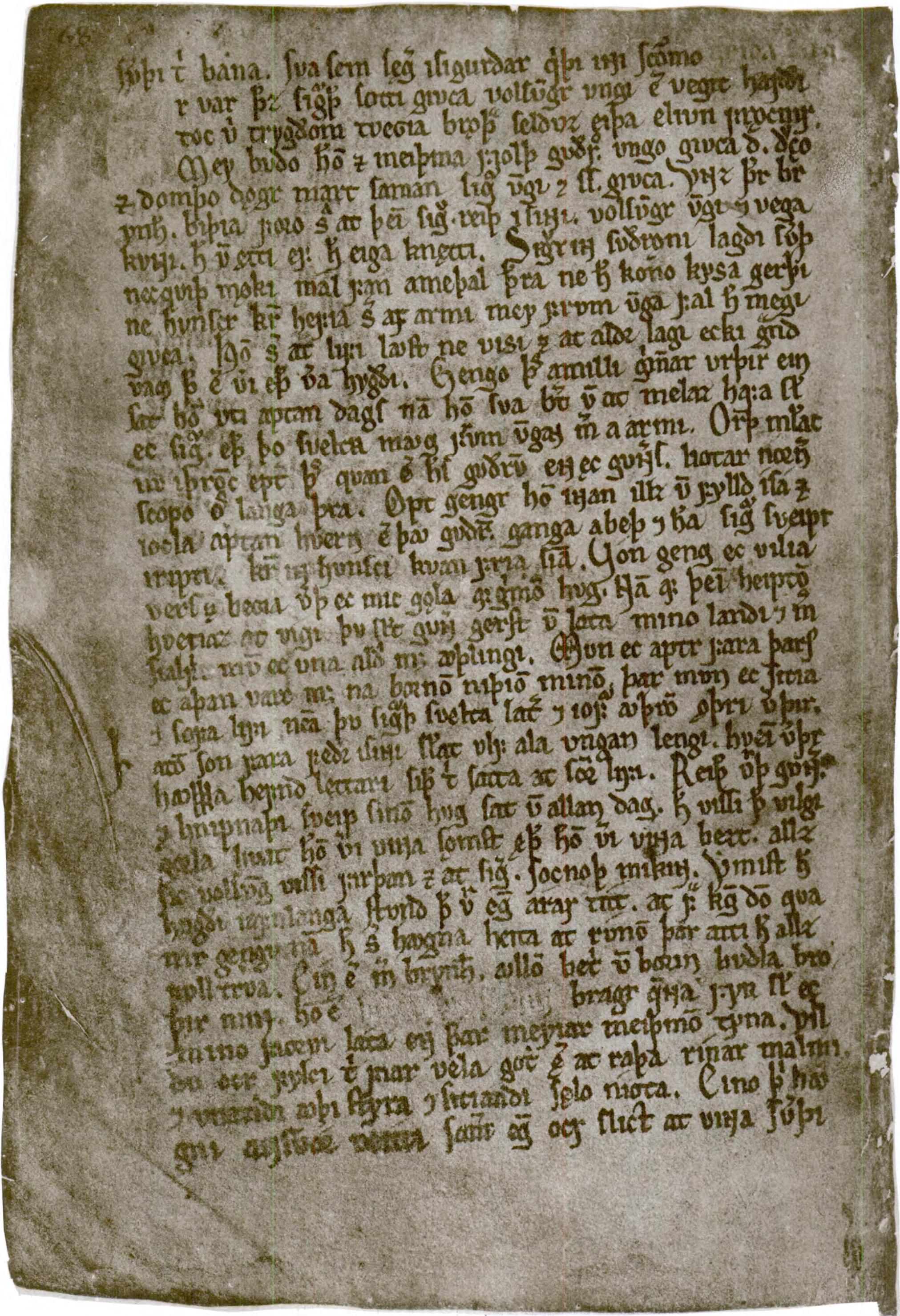 "For logical reasons, the Codex Regius (Gammel kongelig samling 2365 4to) is today regarded as one of the national treasures of Iceland. Significantly, it was one of the first two manuscripts to be returned to Iceland from Denmark in 1971. Its central importance is that it contains a (slightly rusty) key to the pagan religious world not only of the settlers of Iceland, but also of the people of Scandinavia as a whole, displaying the kind of raw poetic material that Snorri Sturluson utilized when assembling his prose Edda c.1220, and of which Saxo Grammaticus was clearly aware when writing his Gesta Danorum c.1200. It must never be forgotten, however, that the manuscript in question was written nearly 300 years after the official acceptance of Christianity in Iceland (in 999/750). The manuscript's contents may well have ancient, pagan roots, but researchers seeking to make use of this material should remember that it is likely to have existed in oral tradition long before it came to be recorded; and that while it now exists in textual form, it was originally meant to be received orally and visually in performance rather than read privately. ... To judge from the small size of these manuscripts and the economical use they make of space, neither was judged by the people of the time as being as important as, for example, the Möðruvallabók and Flateyjarbók manuscripts of the sagas, or the Stjórn manuscript of part of the Bible." Einar G. Petursson, Medieval Scandinavia, (1988): "Codex Regius of the Poetic Edda is an Icelandic manuscript of ninety small quarto pages, but the fifth gathering, probably 16 pages, is now lost. The manuscript was written by one hand not known elsewhere, and is dated palaeographically to about 1270-1280. Codex Regius is the most important manuscript of eddic poetry. It now contains 29 poems in systemic order; the first 10 lays are about the ancient Norse gods, but the remaining part is about ancient heroes. Codex Regius is a copy of an older manuscript now lost. The fragmentary AM 748 I 4to contains, in no particular order, seven eddic lays, and one of them, Baldrs draumr, is not preserved elsewhere. This manuscript is dated to about 1300 or a little later. The textual relationship between the two manuscripts points to a common written original. In the 1220s, Snorri Sturlusson wrote a textbook on poetry, called Snorra Edda or the Prose Edda. It is almost certain that he used the text of the mythical poems Vafþrúðnismál and Grímnismál from the common written source underlying the Poetic Edda. "...It is not known whether Codex Regius had a name originally. In 1623, Jón Guðmundsson lærði ('the learned') mentioned for the first time an Edda Sæmundr Sigfússon fróði ('the wise'; 1056-1133), older than Snorra Edda. In 1643, when Bishop Brynjólfur Sveinsson in Skáholt obtained Codex Regius (we do not know from where), he believed it was the Edda by Sæmundar, although it is now thought that Sæmundar played no role in collecting or writing Codex Regius. A name and note in the manuscript indicate that it had been in Skagafjörður (in the north) or on the Reykjanes peninsula (southwest) during the previous years. The last poem before the lacuna is Sigrdrifumál, with the last part of it missing. This poem is preserved complete in paper copies from the 17th century. The lay is found in Völsungasaga as well, but in 1641 Brynjólfur Sveinsson received the only parchment manuscript of this saga, and at least two commentaries on Sigurdrifumál were written for him. It seems certian that there is a direct connection between the copying of the complete text of Sigrdrifumál and the activities in connection with Völsungasaga after 1641. The lacuna in Codex Regius accordingly occurred after 1641, but before 1643. Brynjólfur Sveinsson presented the manuscript to the King of Denmark in 1662, hence the name Codex Regius ('King's Book'). In the Royal Library, it was given number GkS 2365 4to. It was brought back to Iceland on April 21, 1971, and is now in the Árni Magnússon Institute in Iceland." Gudbrand Vigfússon, Corpus Poeticum Boreale, 1883: "Chief of all Icelandic manuscripts, the treasure of the Royal Library at Copenhagen is Codex Regius (R), no. 2365, the history of whose appearance in the learned world we have already spoken of; a narrow octavo, now in an 18th century binding, with the royal arms of Christian VII (c. 1780). What its former binding in Bishop's Brynjólf's days was, is not known; the second binder did the vellum some harm by plowing its edges. We should have liked to have had its original cover, but that was probably lost before the worthy, but misguided, librarian ordered it a new coat. It consists of five complete sheets and one final sheet, from which three blank leaves have been cut; but between the fourth and the fifth sheets a sheet at least is missing (the sheet of the Lacuna). This Lacuna existed when Bishop Byrnjólf got the manuscript for he has noted at the top of the fifth sheet, 'λόγος άκεΦαλος' ['A speech or tale without beginning']. But for this the manuscript is perfect. The first page, dark and grimy, is yet perfectly preserved, signed by the good Bishop's monogram. There is no superscription (Edda or otherwise) in the old hand." [etc.] |