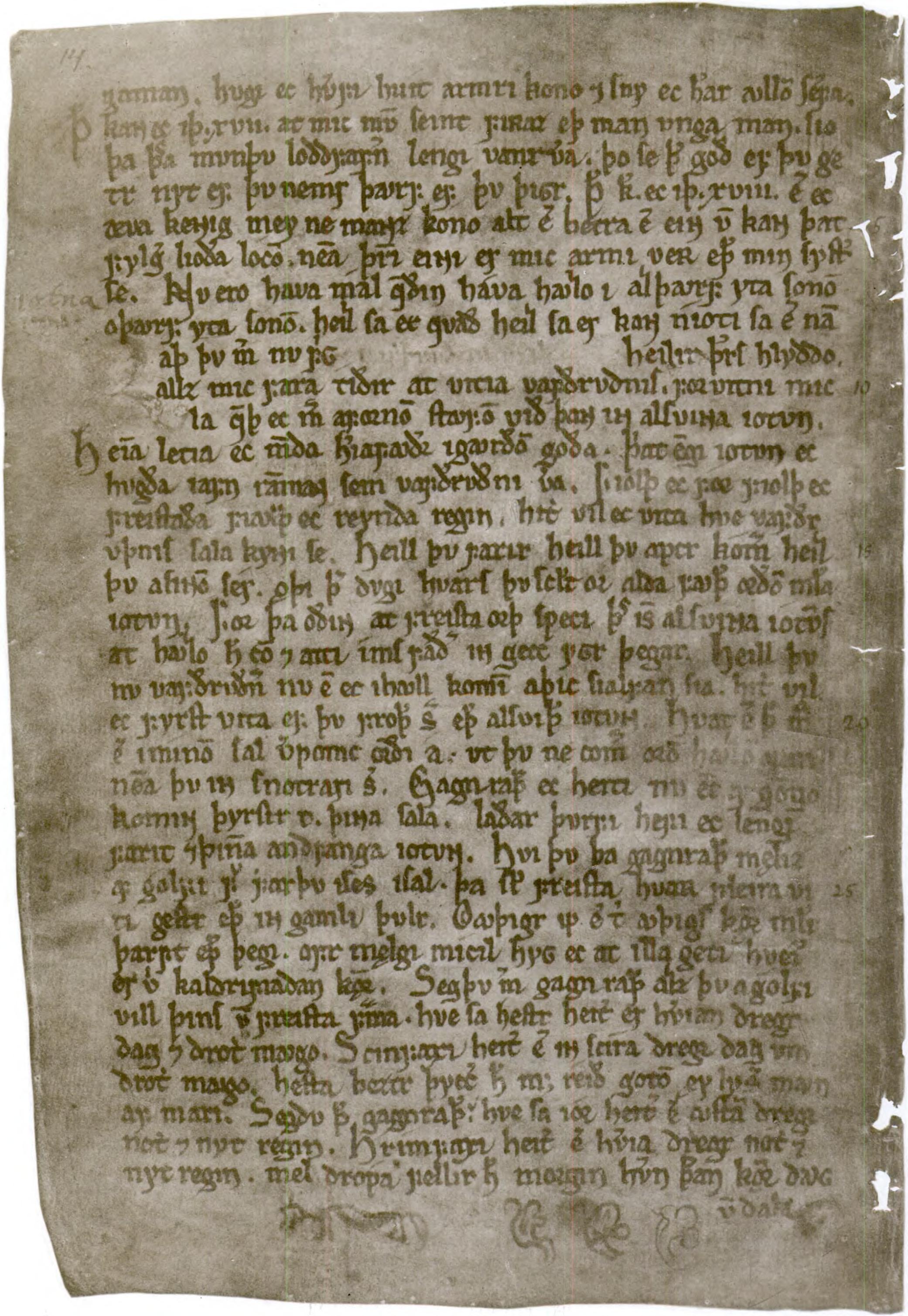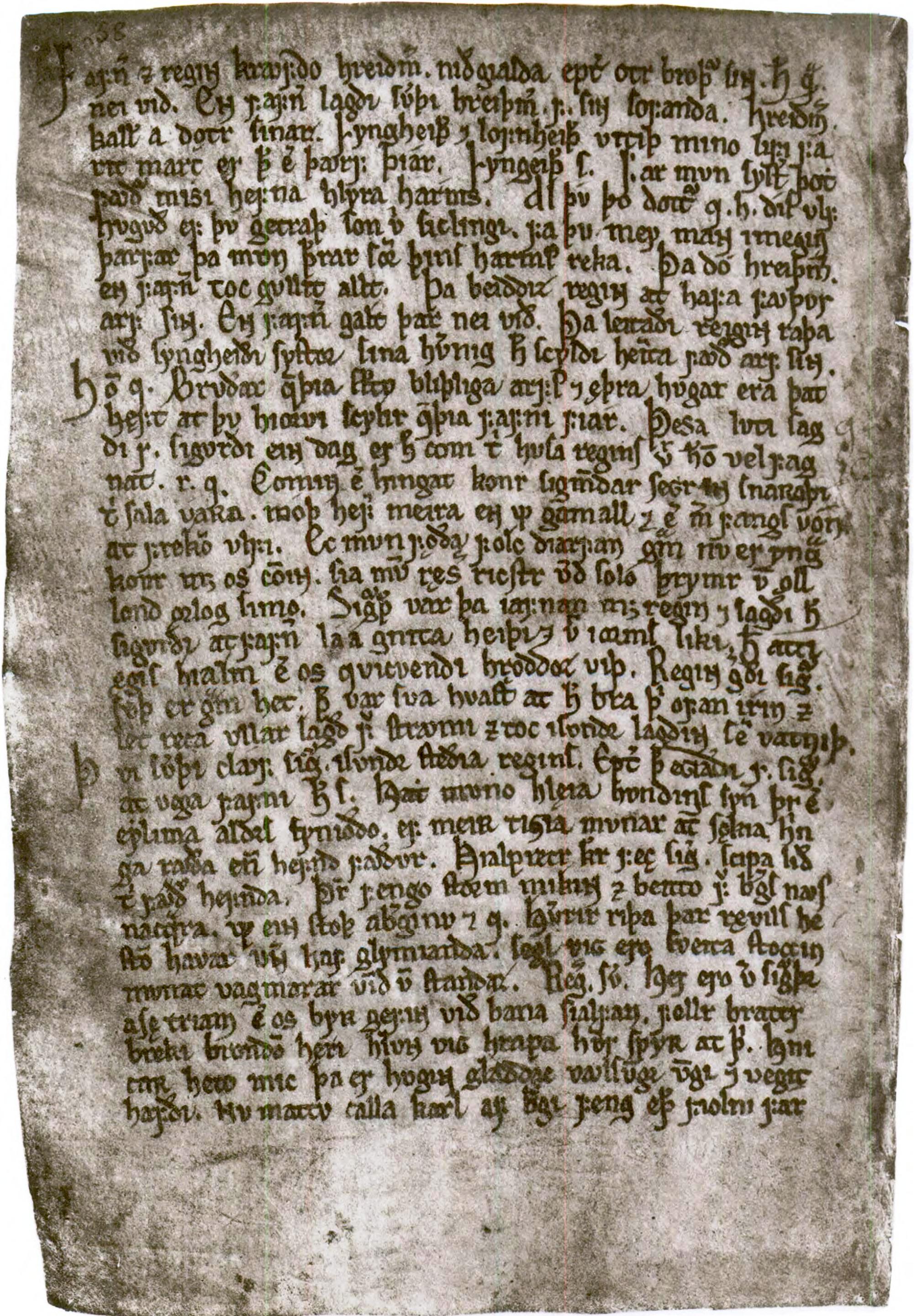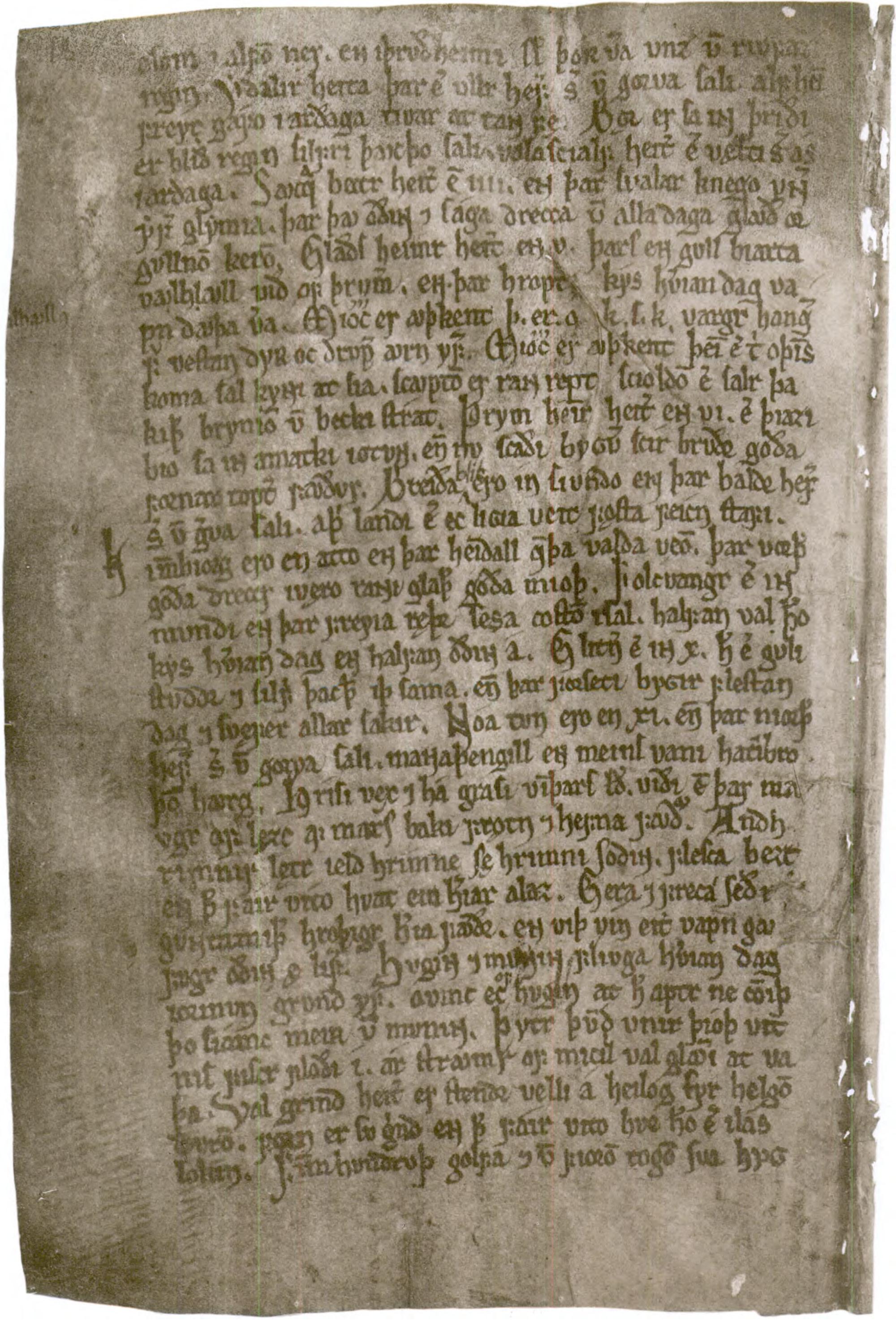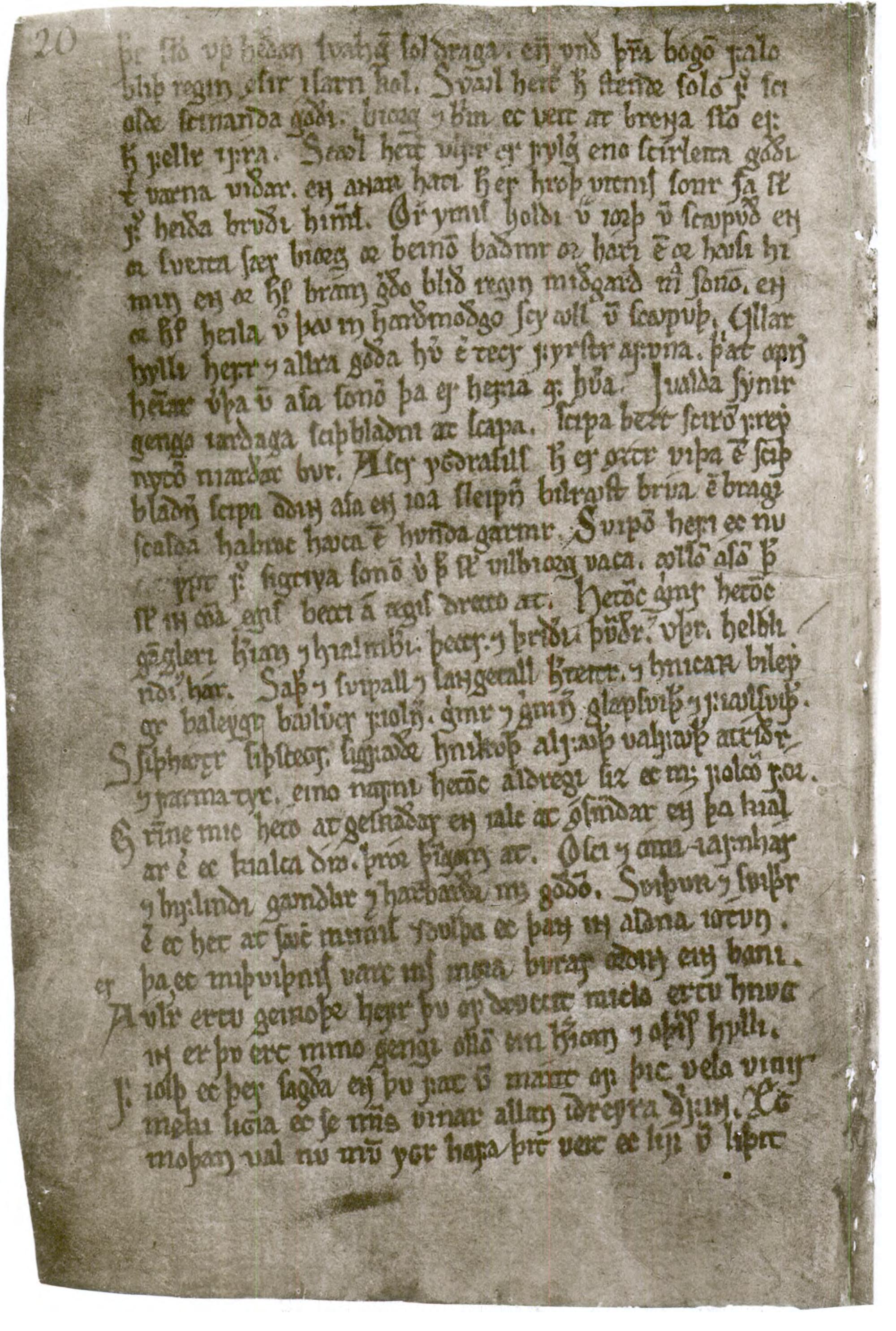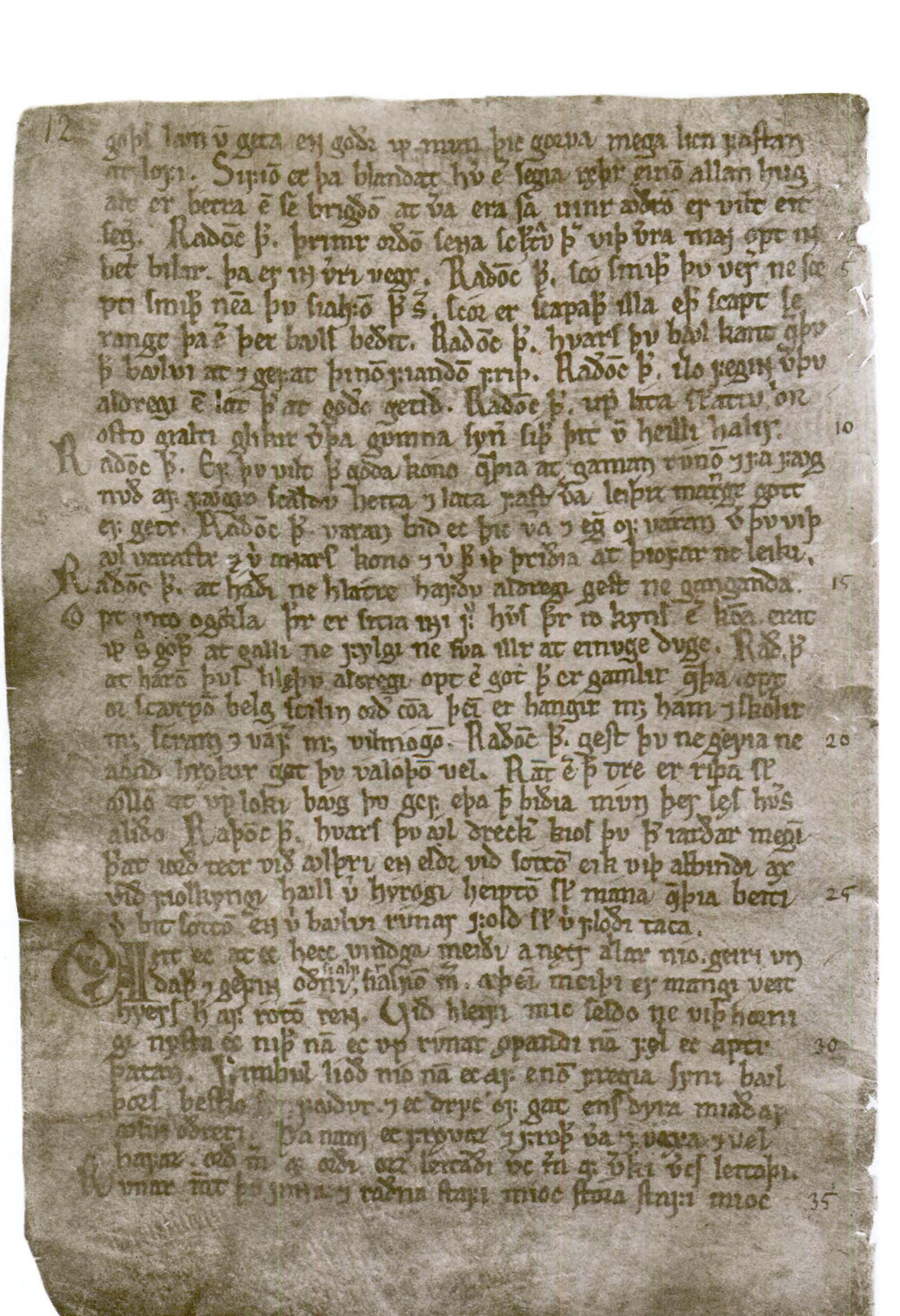 "For logical reasons, the Codex Regius (Gammel kongelig samling 2365 4to) is today regarded as one of the national treasures of Iceland. Significantly, it was one of the first two manuscripts to be returned to Iceland from Denmark in 1971. Its central importance is that it contains a (slightly rusty) key to the pagan religious world not only of the settlers of Iceland, but also of the people of Scandinavia as a whole, displaying the kind of raw poetic material that Snorri Sturluson utilized when assembling his prose Edda c.1220, and of which Saxo Grammaticus was clearly aware when writing his Gesta Danorum c.1200. It must never be forgotten, however, that the manuscript in question was written nearly 300 years after the official acceptance of Christianity in Iceland (in 999/750). The manuscript's contents may well have ancient, pagan roots, but researchers seeking to make use of this material should remember that it is likely to have existed in oral tradition long before it came to be recorded; and that while it now exists in textual form, it was originally meant to be received orally and visually in performance rather than read privately. ... To judge from the small size of these manuscripts and the economical use they make of space, neither was judged by the people of the time as being as important as, for example, the Möðruvallabók and Flateyjarbók manuscripts of the sagas, or the Stjórn manuscript of part of the Bible." Einar G. Petursson, Medieval Scandinavia, (1988): "Codex Regius of the Poetic Edda is an Icelandic manuscript of ninety small quarto pages, but the fifth gathering, probably 16 pages, is now lost. The manuscript was written by one hand not known elsewhere, and is dated palaeographically to about 1270-1280. Codex Regius is the most important manuscript of eddic poetry. It now contains 29 poems in systemic order; the first 10 lays are about the ancient Norse gods, but the remaining part is about ancient heroes. Codex Regius is a copy of an older manuscript now lost. The fragmentary AM 748 I 4to contains, in no particular order, seven eddic lays, and one of them, Baldrs draumr, is not preserved elsewhere. This manuscript is dated to about 1300 or a little later. The textual relationship between the two manuscripts points to a common written original. In the 1220s, Snorri Sturlusson wrote a textbook on poetry, called Snorra Edda or the Prose Edda. It is almost certain that he used the text of the mythical poems Vafþrúðnismál and Grímnismál from the common written source underlying the Poetic Edda. "...It is not known whether Codex Regius had a name originally. In 1623, Jón Guðmundsson lærði ('the learned') mentioned for the first time an Edda Sæmundr Sigfússon fróði ('the wise'; 1056-1133), older than Snorra Edda. In 1643, when Bishop Brynjólfur Sveinsson in Skáholt obtained Codex Regius (we do not know from where), he believed it was the Edda by Sæmundar, although it is now thought that Sæmundar played no role in collecting or writing Codex Regius. A name and note in the manuscript indicate that it had been in Skagafjörður (in the north) or on the Reykjanes peninsula (southwest) during the previous years. The last poem before the lacuna is Sigrdrifumál, with the last part of it missing. This poem is preserved complete in paper copies from the 17th century. The lay is found in Völsungasaga as well, but in 1641 Brynjólfur Sveinsson received the only parchment manuscript of this saga, and at least two commentaries on Sigurdrifumál were written for him. It seems certian that there is a direct connection between the copying of the complete text of Sigrdrifumál and the activities in connection with Völsungasaga after 1641. The lacuna in Codex Regius accordingly occurred after 1641, but before 1643. Brynjólfur Sveinsson presented the manuscript to the King of Denmark in 1662, hence the name Codex Regius ('King's Book'). In the Royal Library, it was given number GkS 2365 4to. It was brought back to Iceland on April 21, 1971, and is now in the Árni Magnússon Institute in Iceland." Gudbrand Vigfússon, Corpus Poeticum Boreale, 1883: "Chief of all Icelandic manuscripts, the treasure of the Royal Library at Copenhagen is Codex Regius (R), no. 2365, the history of whose appearance in the learned world we have already spoken of; a narrow octavo, now in an 18th century binding, with the royal arms of Christian VII (c. 1780). What its former binding in Bishop's Brynjólf's days was, is not known; the second binder did the vellum some harm by plowing its edges. We should have liked to have had its original cover, but that was probably lost before the worthy, but misguided, librarian ordered it a new coat. It consists of five complete sheets and one final sheet, from which three blank leaves have been cut; but between the fourth and the fifth sheets a sheet at least is missing (the sheet of the Lacuna). This Lacuna existed when Bishop Byrnjólf got the manuscript for he has noted at the top of the fifth sheet, 'λόγος άκεΦαλος' ['A speech or tale without beginning']. But for this the manuscript is perfect. The first page, dark and grimy, is yet perfectly preserved, signed by the good Bishop's monogram. There is no superscription (Edda or otherwise) in the old hand." [etc.] |