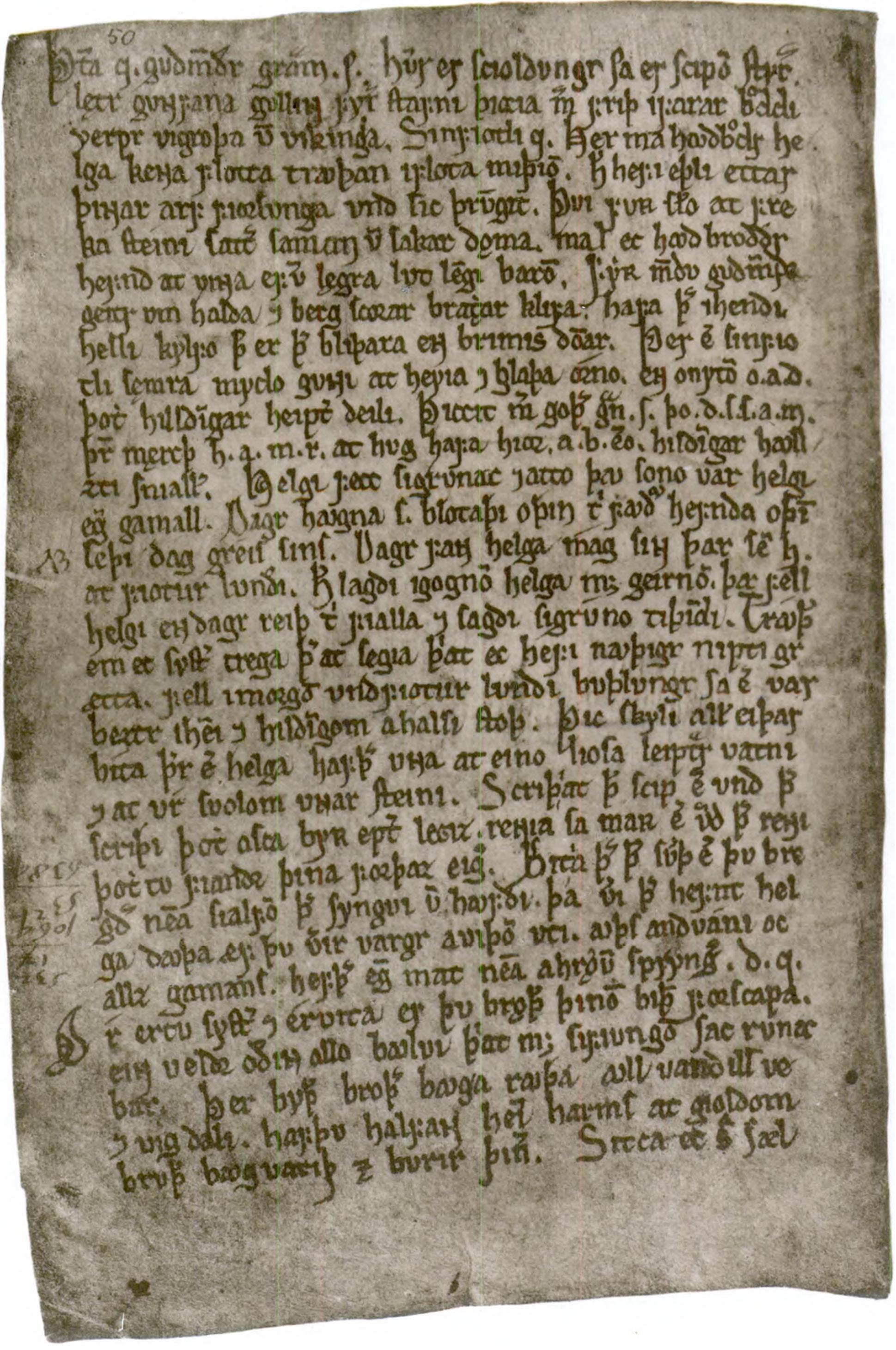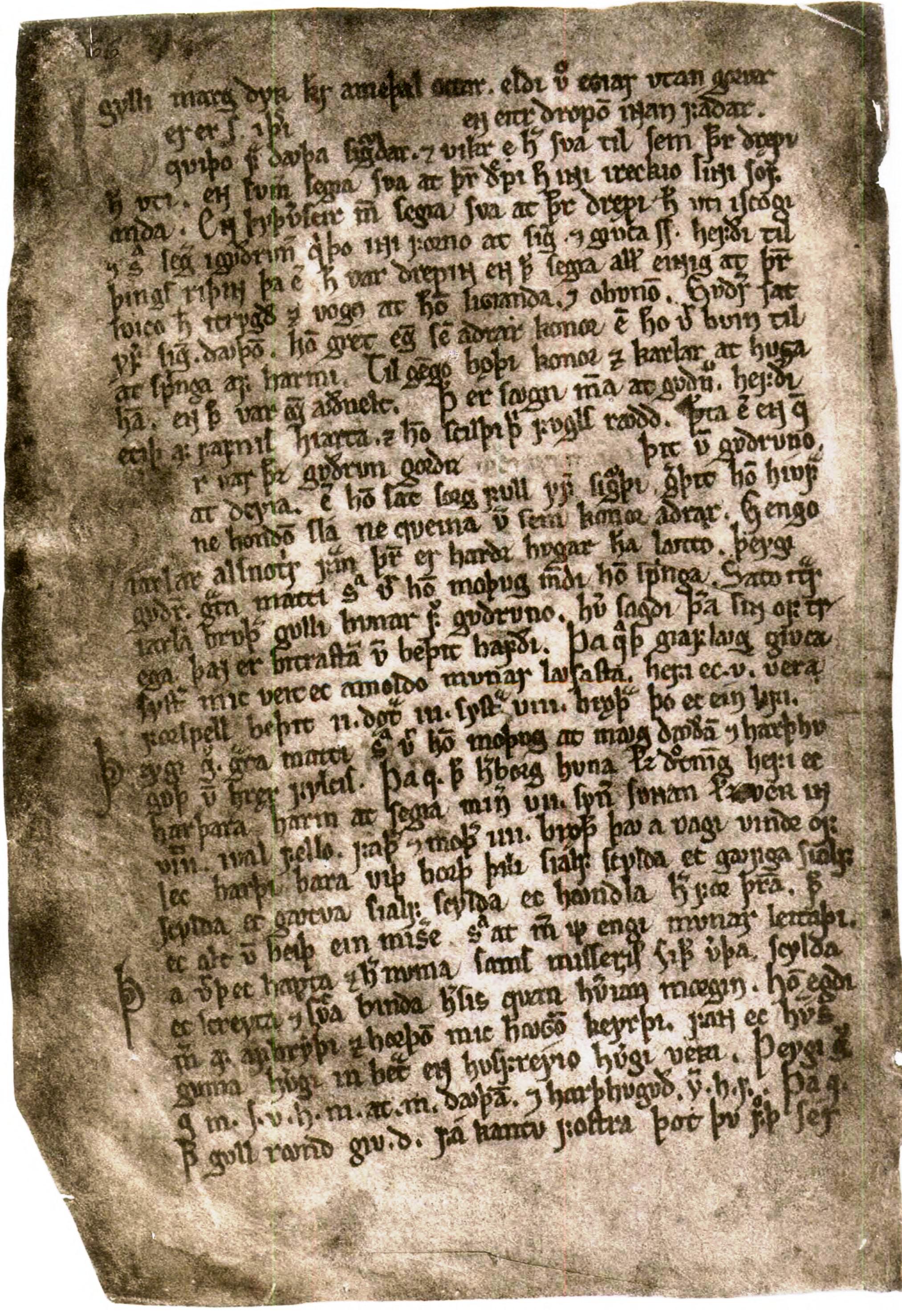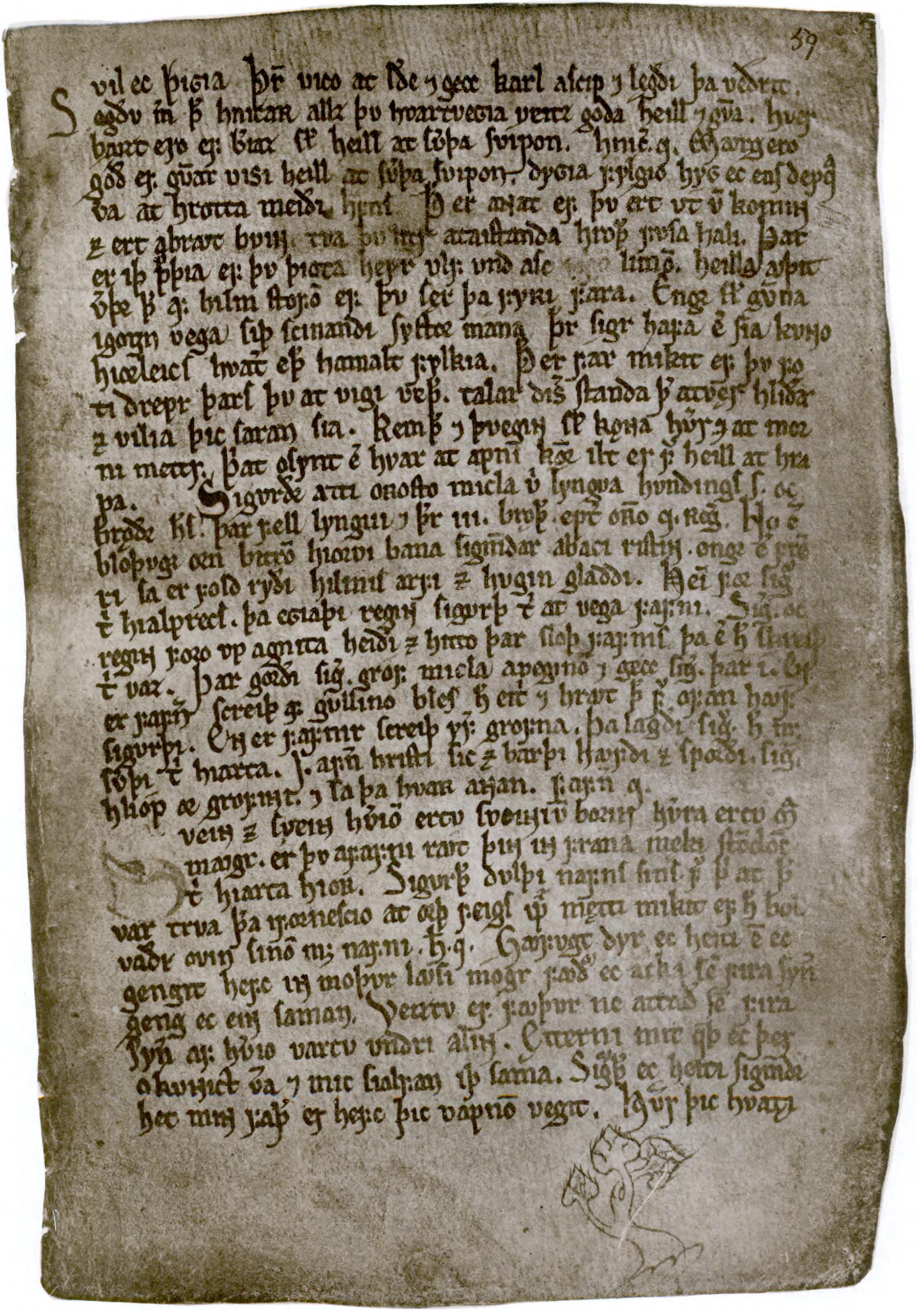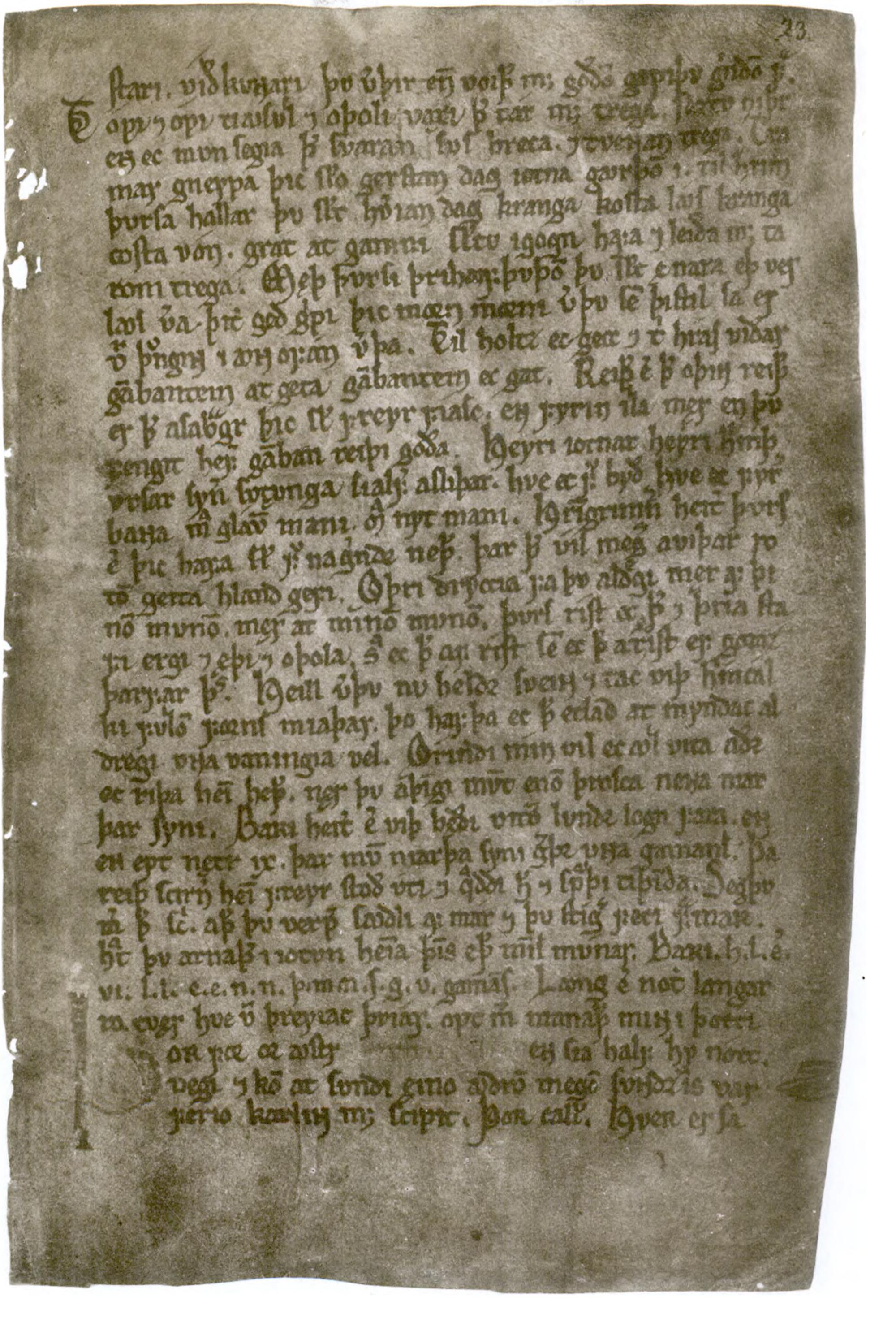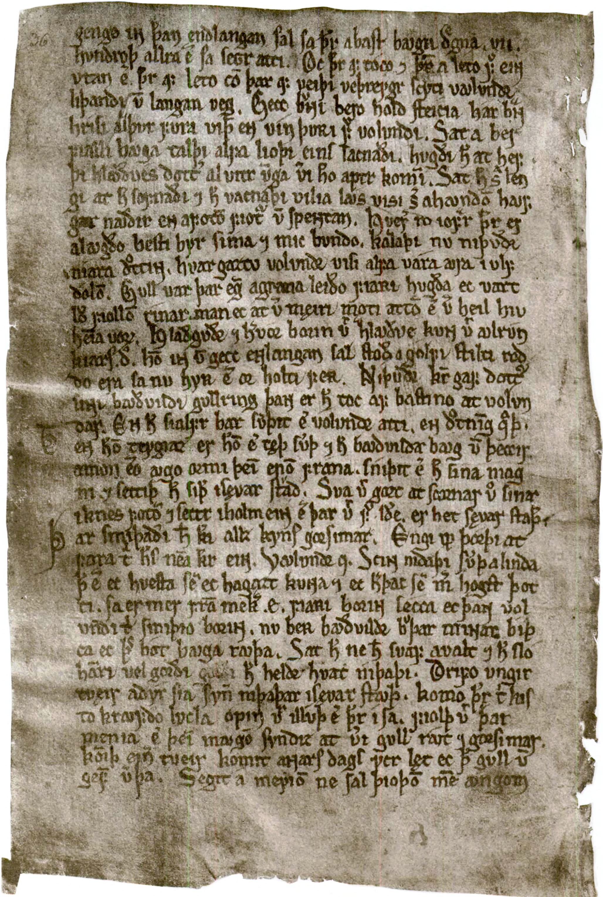 "For logical reasons, the Codex Regius (Gammel kongelig samling 2365 4to) is today regarded as one of the national treasures of Iceland. Significantly, it was one of the first two manuscripts to be returned to Iceland from Denmark in 1971. Its central importance is that it contains a (slightly rusty) key to the pagan religious world not only of the settlers of Iceland, but also of the people of Scandinavia as a whole, displaying the kind of raw poetic material that Snorri Sturluson utilized when assembling his prose Edda c.1220, and of which Saxo Grammaticus was clearly aware when writing his Gesta Danorum c.1200. It must never be forgotten, however, that the manuscript in question was written nearly 300 years after the official acceptance of Christianity in Iceland (in 999/750). The manuscript's contents may well have ancient, pagan roots, but researchers seeking to make use of this material should remember that it is likely to have existed in oral tradition long before it came to be recorded; and that while it now exists in textual form, it was originally meant to be received orally and visually in performance rather than read privately. ... To judge from the small size of these manuscripts and the economical use they make of space, neither was judged by the people of the time as being as important as, for example, the Möðruvallabók and Flateyjarbók manuscripts of the sagas, or the Stjórn manuscript of part of the Bible." Einar G. Petursson, Medieval Scandinavia, (1988): "Codex Regius of the Poetic Edda is an Icelandic manuscript of ninety small quarto pages, but the fifth gathering, probably 16 pages, is now lost. The manuscript was written by one hand not known elsewhere, and is dated palaeographically to about 1270-1280. Codex Regius is the most important manuscript of eddic poetry. It now contains 29 poems in systemic order; the first 10 lays are about the ancient Norse gods, but the remaining part is about ancient heroes. Codex Regius is a copy of an older manuscript now lost. The fragmentary AM 748 I 4to contains, in no particular order, seven eddic lays, and one of them, Baldrs draumr, is not preserved elsewhere. This manuscript is dated to about 1300 or a little later. The textual relationship between the two manuscripts points to a common written original. In the 1220s, Snorri Sturlusson wrote a textbook on poetry, called Snorra Edda or the Prose Edda. It is almost certain that he used the text of the mythical poems Vafþrúðnismál and Grímnismál from the common written source underlying the Poetic Edda. "...It is not known whether Codex Regius had a name originally. In 1623, Jón Guðmundsson lærði ('the learned') mentioned for the first time an Edda Sæmundr Sigfússon fróði ('the wise'; 1056-1133), older than Snorra Edda. In 1643, when Bishop Brynjólfur Sveinsson in Skáholt obtained Codex Regius (we do not know from where), he believed it was the Edda by Sæmundar, although it is now thought that Sæmundar played no role in collecting or writing Codex Regius. A name and note in the manuscript indicate that it had been in Skagafjörður (in the north) or on the Reykjanes peninsula (southwest) during the previous years. The last poem before the lacuna is Sigrdrifumál, with the last part of it missing. This poem is preserved complete in paper copies from the 17th century. The lay is found in Völsungasaga as well, but in 1641 Brynjólfur Sveinsson received the only parchment manuscript of this saga, and at least two commentaries on Sigurdrifumál were written for him. It seems certian that there is a direct connection between the copying of the complete text of Sigrdrifumál and the activities in connection with Völsungasaga after 1641. The lacuna in Codex Regius accordingly occurred after 1641, but before 1643. Brynjólfur Sveinsson presented the manuscript to the King of Denmark in 1662, hence the name Codex Regius ('King's Book'). In the Royal Library, it was given number GkS 2365 4to. It was brought back to Iceland on April 21, 1971, and is now in the Árni Magnússon Institute in Iceland." Gudbrand Vigfússon, Corpus Poeticum Boreale, 1883: "Chief of all Icelandic manuscripts, the treasure of the Royal Library at Copenhagen is Codex Regius (R), no. 2365, the history of whose appearance in the learned world we have already spoken of; a narrow octavo, now in an 18th century binding, with the royal arms of Christian VII (c. 1780). What its former binding in Bishop's Brynjólf's days was, is not known; the second binder did the vellum some harm by plowing its edges. We should have liked to have had its original cover, but that was probably lost before the worthy, but misguided, librarian ordered it a new coat. It consists of five complete sheets and one final sheet, from which three blank leaves have been cut; but between the fourth and the fifth sheets a sheet at least is missing (the sheet of the Lacuna). This Lacuna existed when Bishop Byrnjólf got the manuscript for he has noted at the top of the fifth sheet, 'λόγος άκεΦαλος' ['A speech or tale without beginning']. But for this the manuscript is perfect. The first page, dark and grimy, is yet perfectly preserved, signed by the good Bishop's monogram. There is no superscription (Edda or otherwise) in the old hand." [etc.] |