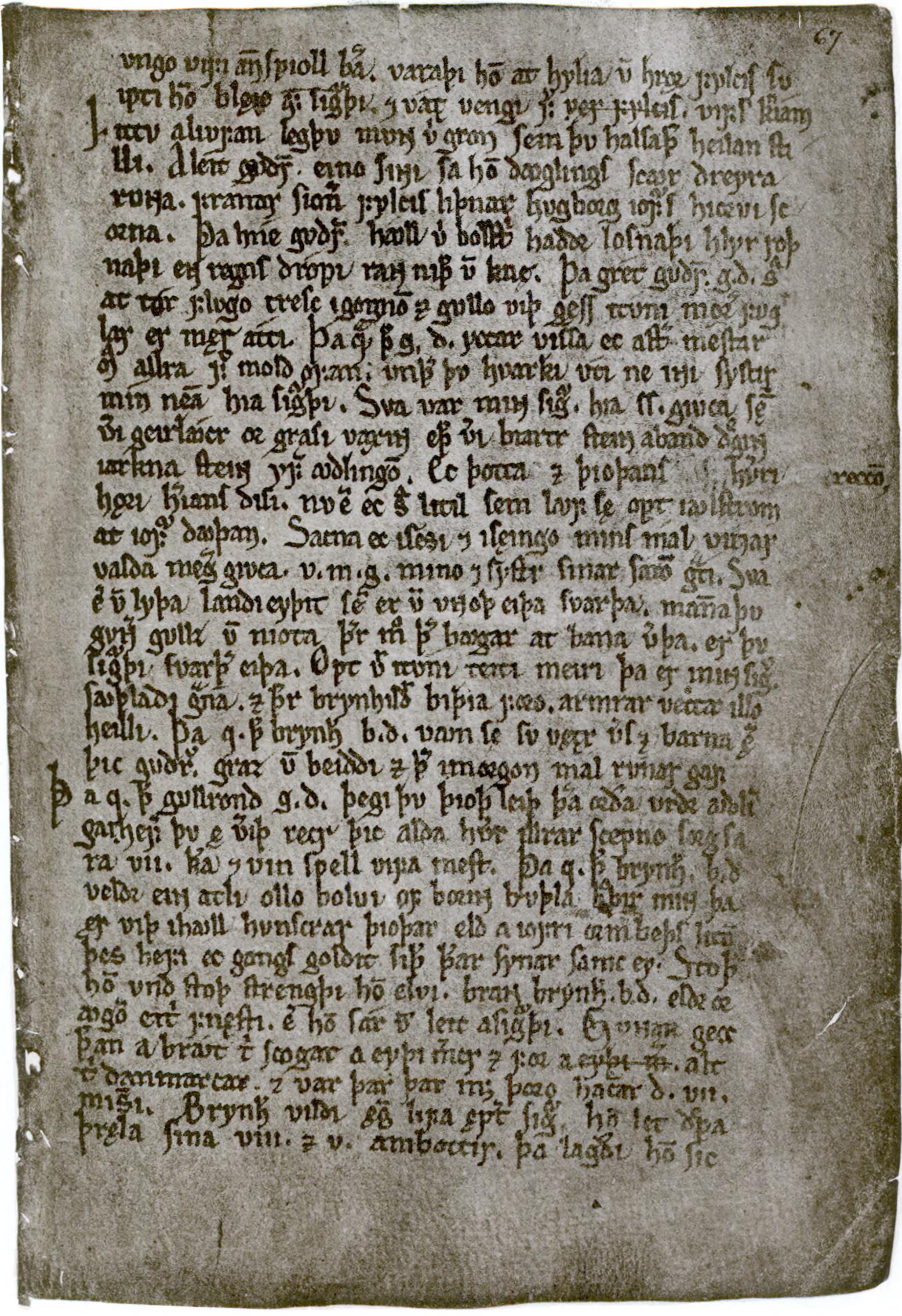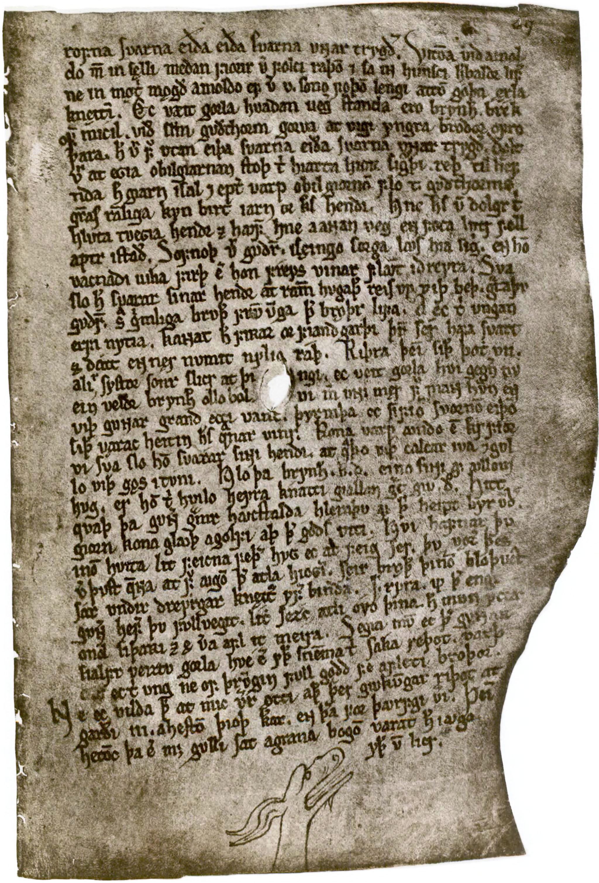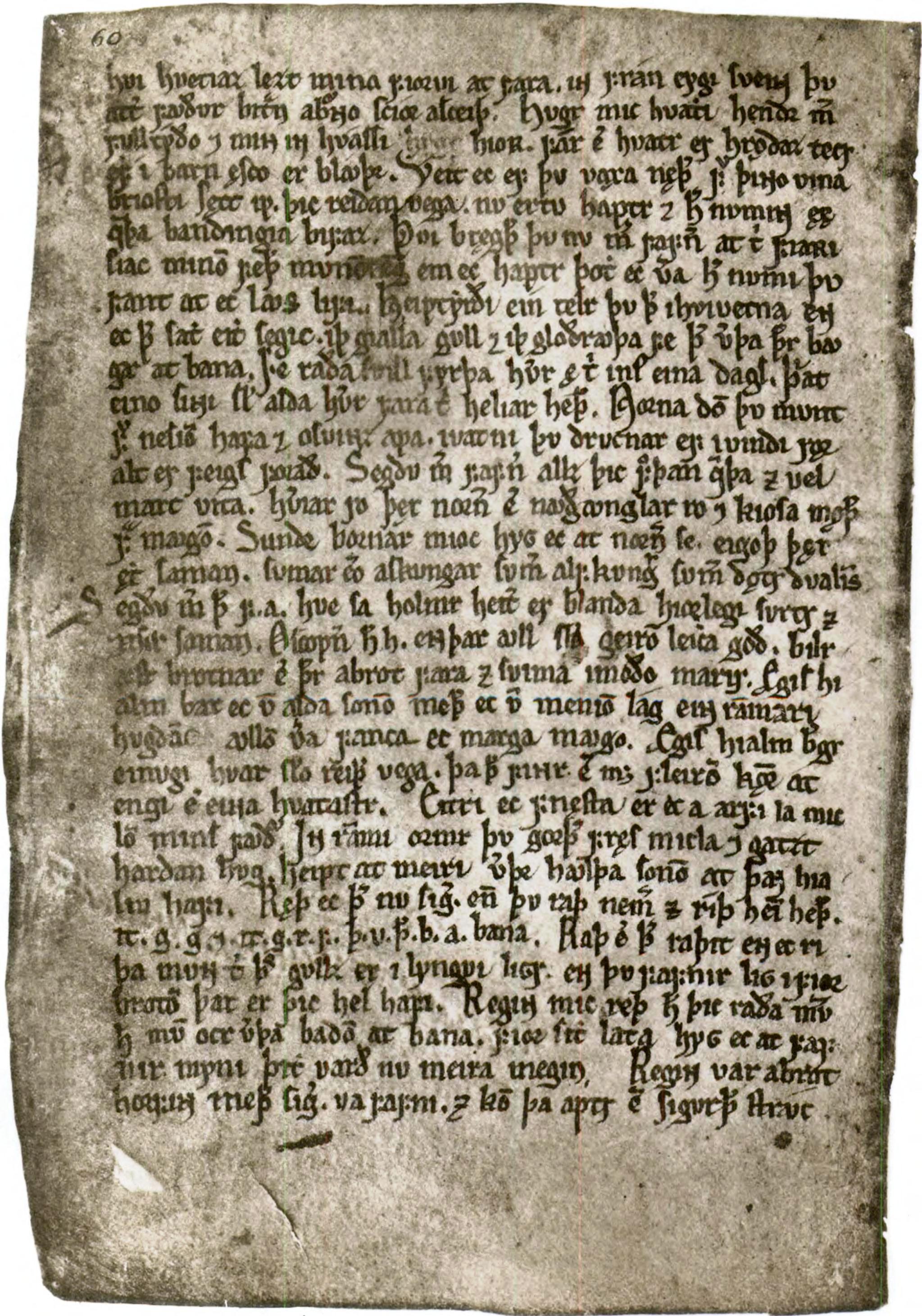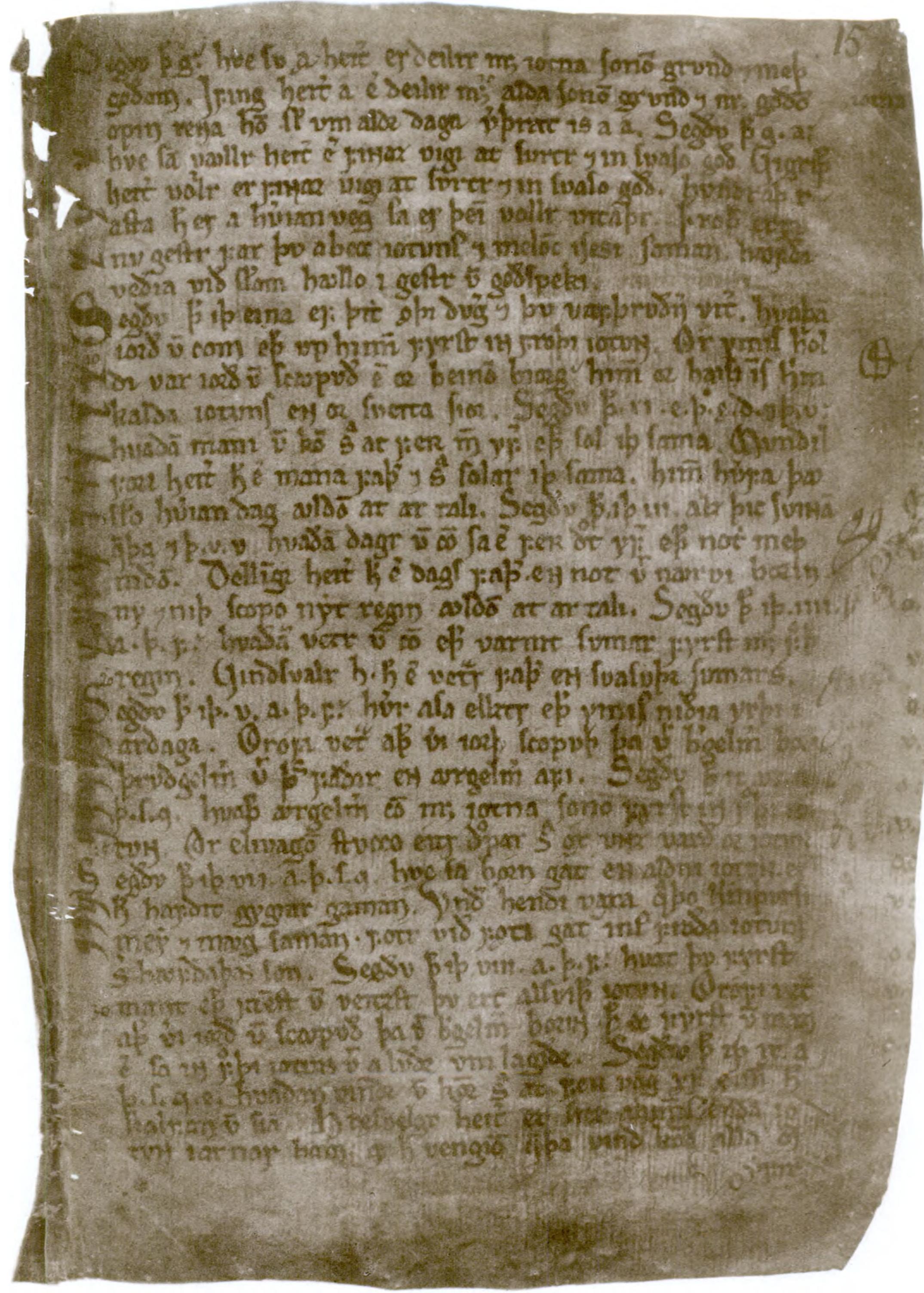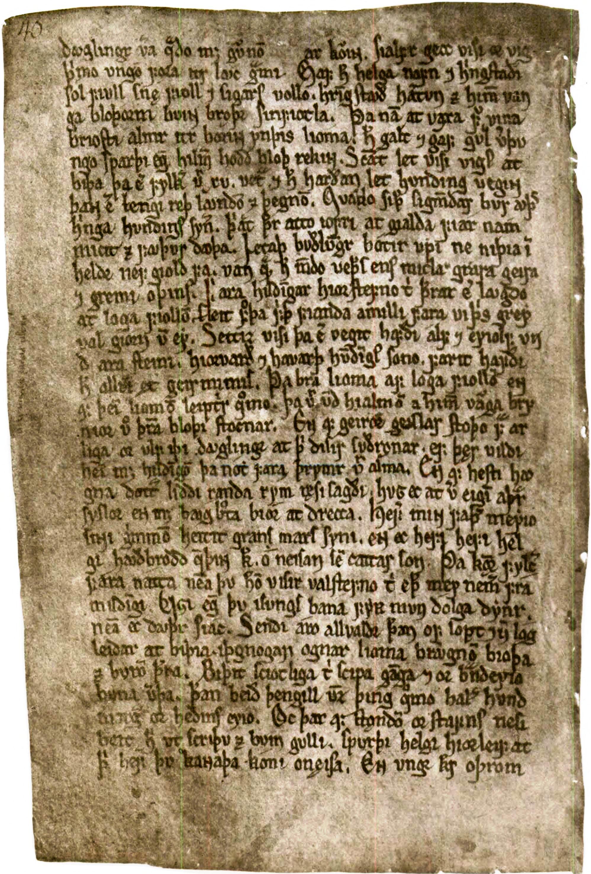 "For logical reasons, the Codex Regius (Gammel kongelig samling 2365 4to) is today regarded as one of the national treasures of Iceland. Significantly, it was one of the first two manuscripts to be returned to Iceland from Denmark in 1971. Its central importance is that it contains a (slightly rusty) key to the pagan religious world not only of the settlers of Iceland, but also of the people of Scandinavia as a whole, displaying the kind of raw poetic material that Snorri Sturluson utilized when assembling his prose Edda c.1220, and of which Saxo Grammaticus was clearly aware when writing his Gesta Danorum c.1200. It must never be forgotten, however, that the manuscript in question was written nearly 300 years after the official acceptance of Christianity in Iceland (in 999/750). The manuscript's contents may well have ancient, pagan roots, but researchers seeking to make use of this material should remember that it is likely to have existed in oral tradition long before it came to be recorded; and that while it now exists in textual form, it was originally meant to be received orally and visually in performance rather than read privately. ... To judge from the small size of these manuscripts and the economical use they make of space, neither was judged by the people of the time as being as important as, for example, the Möðruvallabók and Flateyjarbók manuscripts of the sagas, or the Stjórn manuscript of part of the Bible." Einar G. Petursson, Medieval Scandinavia, (1988): "Codex Regius of the Poetic Edda is an Icelandic manuscript of ninety small quarto pages, but the fifth gathering, probably 16 pages, is now lost. The manuscript was written by one hand not known elsewhere, and is dated palaeographically to about 1270-1280. Codex Regius is the most important manuscript of eddic poetry. It now contains 29 poems in systemic order; the first 10 lays are about the ancient Norse gods, but the remaining part is about ancient heroes. Codex Regius is a copy of an older manuscript now lost. The fragmentary AM 748 I 4to contains, in no particular order, seven eddic lays, and one of them, Baldrs draumr, is not preserved elsewhere. This manuscript is dated to about 1300 or a little later. The textual relationship between the two manuscripts points to a common written original. In the 1220s, Snorri Sturlusson wrote a textbook on poetry, called Snorra Edda or the Prose Edda. It is almost certain that he used the text of the mythical poems Vafþrúðnismál and Grímnismál from the common written source underlying the Poetic Edda. "...It is not known whether Codex Regius had a name originally. In 1623, Jón Guðmundsson lærði ('the learned') mentioned for the first time an Edda Sæmundr Sigfússon fróði ('the wise'; 1056-1133), older than Snorra Edda. In 1643, when Bishop Brynjólfur Sveinsson in Skáholt obtained Codex Regius (we do not know from where), he believed it was the Edda by Sæmundar, although it is now thought that Sæmundar played no role in collecting or writing Codex Regius. A name and note in the manuscript indicate that it had been in Skagafjörður (in the north) or on the Reykjanes peninsula (southwest) during the previous years. The last poem before the lacuna is Sigrdrifumál, with the last part of it missing. This poem is preserved complete in paper copies from the 17th century. The lay is found in Völsungasaga as well, but in 1641 Brynjólfur Sveinsson received the only parchment manuscript of this saga, and at least two commentaries on Sigurdrifumál were written for him. It seems certian that there is a direct connection between the copying of the complete text of Sigrdrifumál and the activities in connection with Völsungasaga after 1641. The lacuna in Codex Regius accordingly occurred after 1641, but before 1643. Brynjólfur Sveinsson presented the manuscript to the King of Denmark in 1662, hence the name Codex Regius ('King's Book'). In the Royal Library, it was given number GkS 2365 4to. It was brought back to Iceland on April 21, 1971, and is now in the Árni Magnússon Institute in Iceland." Gudbrand Vigfússon, Corpus Poeticum Boreale, 1883: "Chief of all Icelandic manuscripts, the treasure of the Royal Library at Copenhagen is Codex Regius (R), no. 2365, the history of whose appearance in the learned world we have already spoken of; a narrow octavo, now in an 18th century binding, with the royal arms of Christian VII (c. 1780). What its former binding in Bishop's Brynjólf's days was, is not known; the second binder did the vellum some harm by plowing its edges. We should have liked to have had its original cover, but that was probably lost before the worthy, but misguided, librarian ordered it a new coat. It consists of five complete sheets and one final sheet, from which three blank leaves have been cut; but between the fourth and the fifth sheets a sheet at least is missing (the sheet of the Lacuna). This Lacuna existed when Bishop Byrnjólf got the manuscript for he has noted at the top of the fifth sheet, 'λόγος άκεΦαλος' ['A speech or tale without beginning']. But for this the manuscript is perfect. The first page, dark and grimy, is yet perfectly preserved, signed by the good Bishop's monogram. There is no superscription (Edda or otherwise) in the old hand." [etc.] |